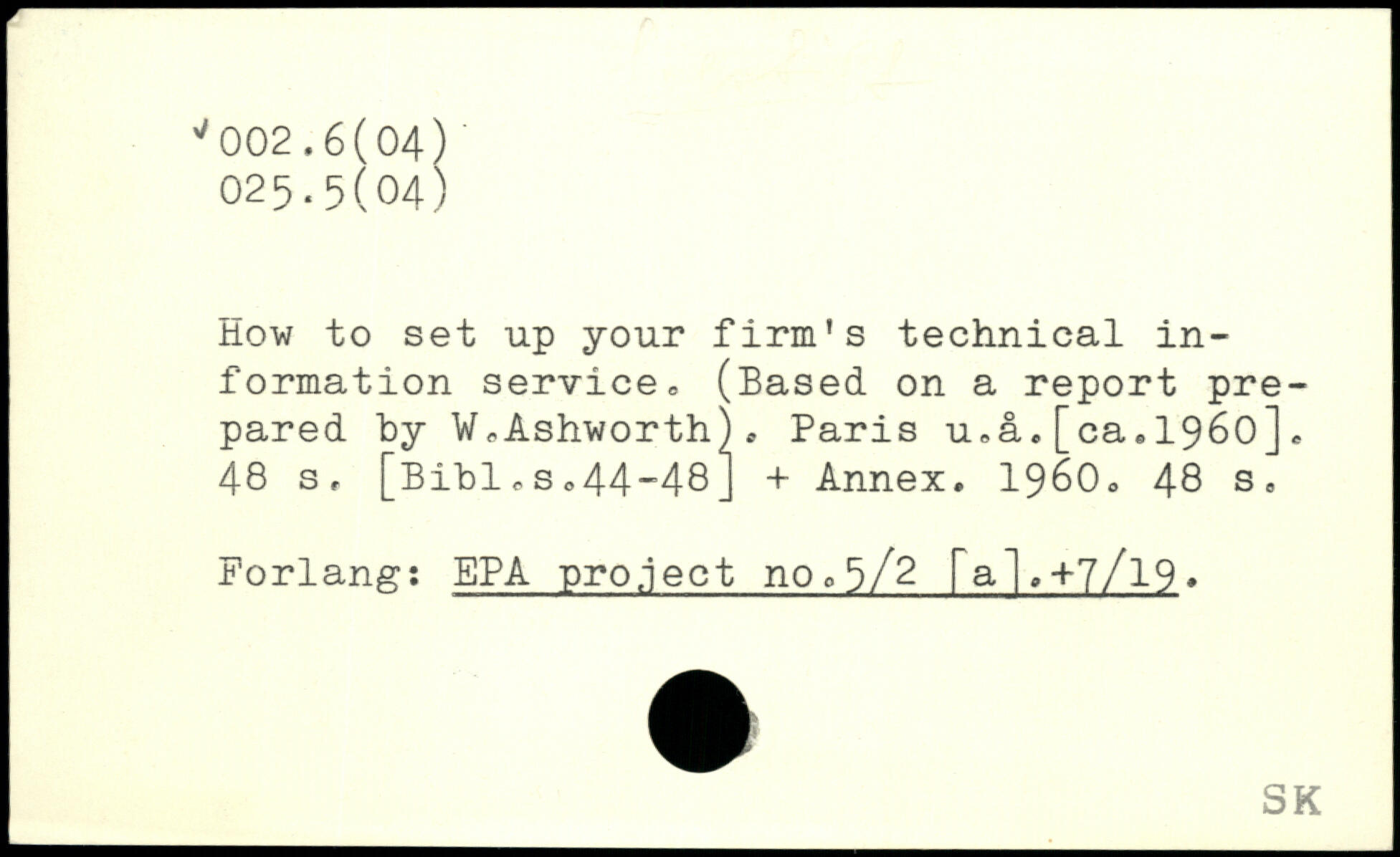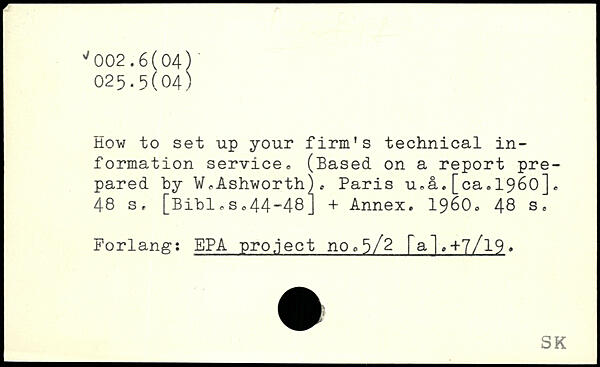 How to set up your firm's technical information service, (Based on a report prepared by W,Ashworth). Paris u.â.[ca.1960].