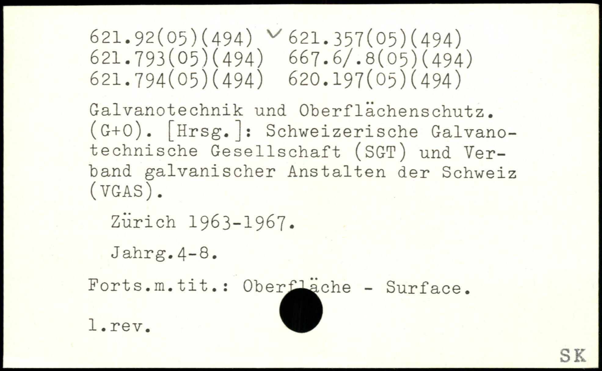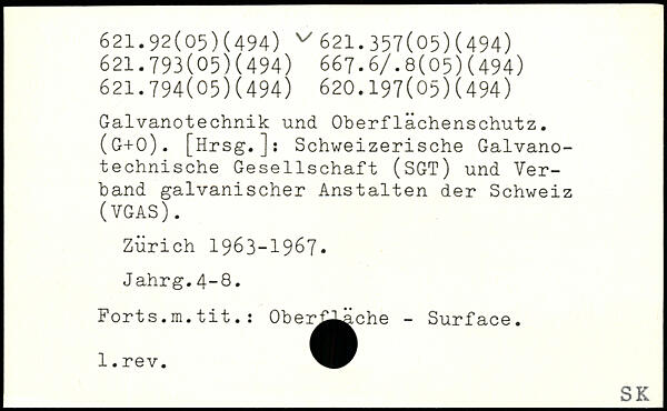 (G+O). [Hrsg.]: Schwe izerische Galvano- ; technische Gesellschaft (SGT) und Verband galvanischer Anstalten der Schweiz (VGAS). Zürich 1963-1967. Jahrg.4-8. Forts.m. tit. : Obeü^^iche - Surface. l.rev.