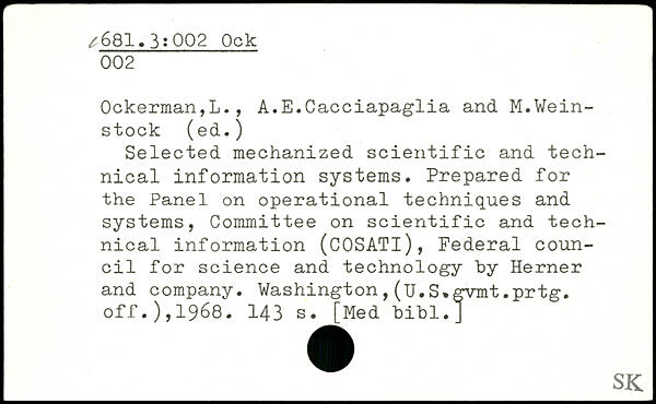 Selected mechanized scientific and technical information systems. Prepared for the Panel on operational techniques and systems, Committee on scientific and technical information (COSATl), Federal council for science and technology by Herner and company. Washington,(u.S.gvmt.prtg. off.),1968.