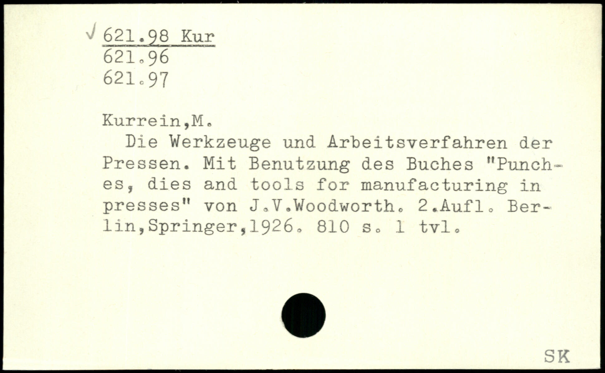 Die Werkzeuge und Arbeitsverfahren der Pressen. Mit Benutzung des Buches "Punches, dies and tools for manufacturing in presses" von J.V.Woodworth.