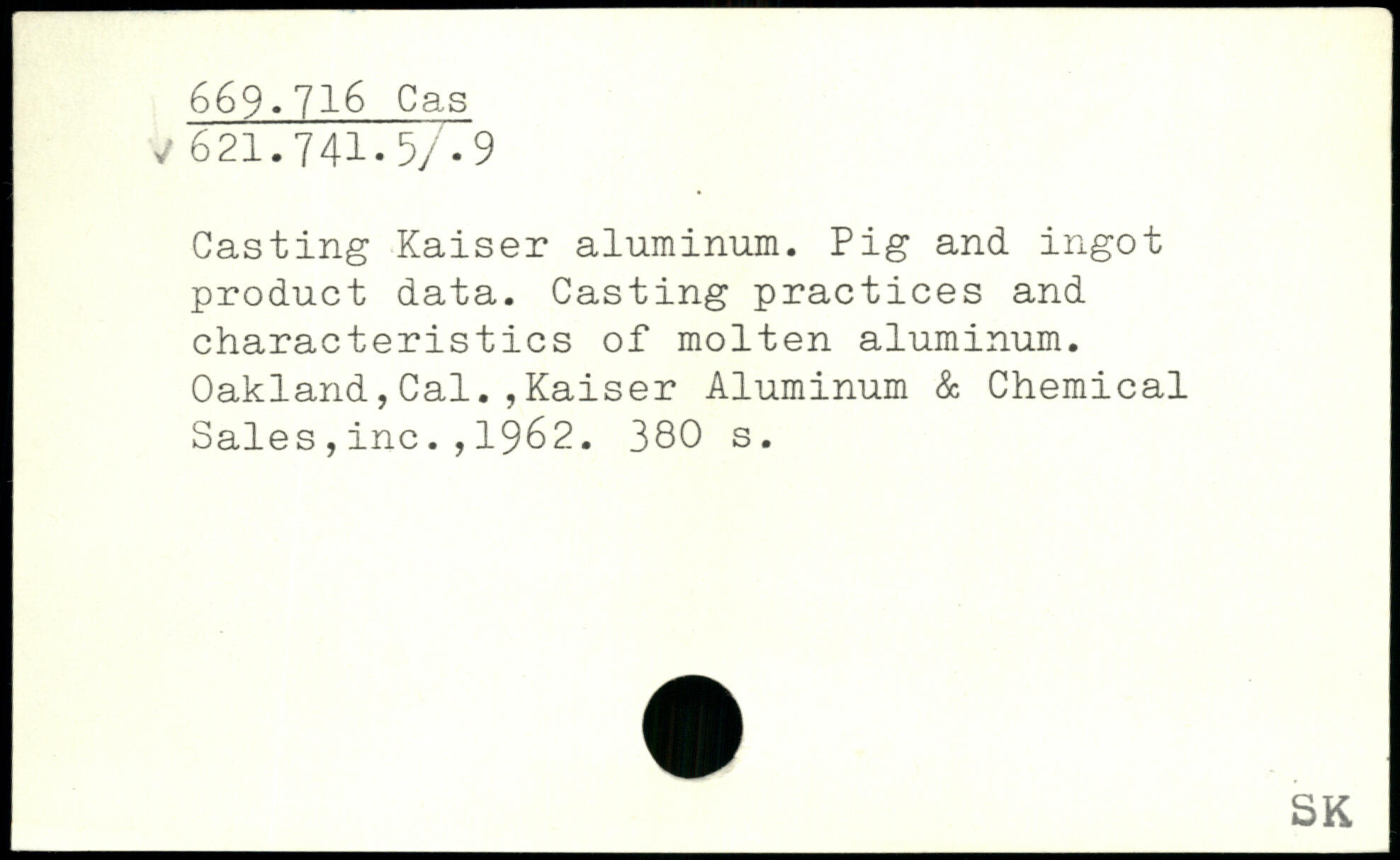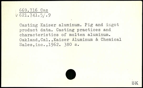 Casting Kaiser aluminum. Pig and ingot product data. Casting practices and characteristics of molten aluminum. Oakland,Cal.,Kaiser Aluminum & Chemical i Sales,inc.,1962.