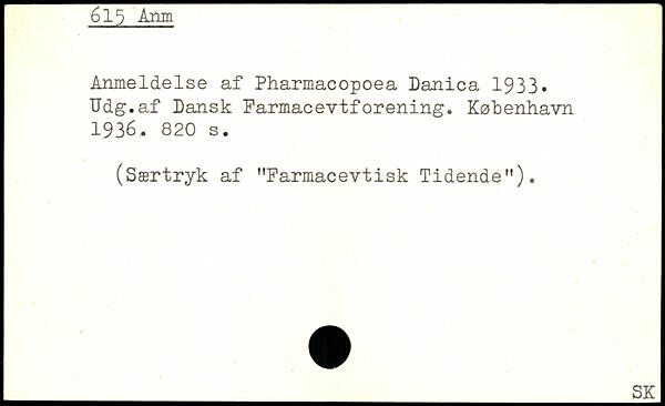 Anmeldelse af Pharmacopoea Danica 1933. TJdg.af Dansk Farmacevtforening.