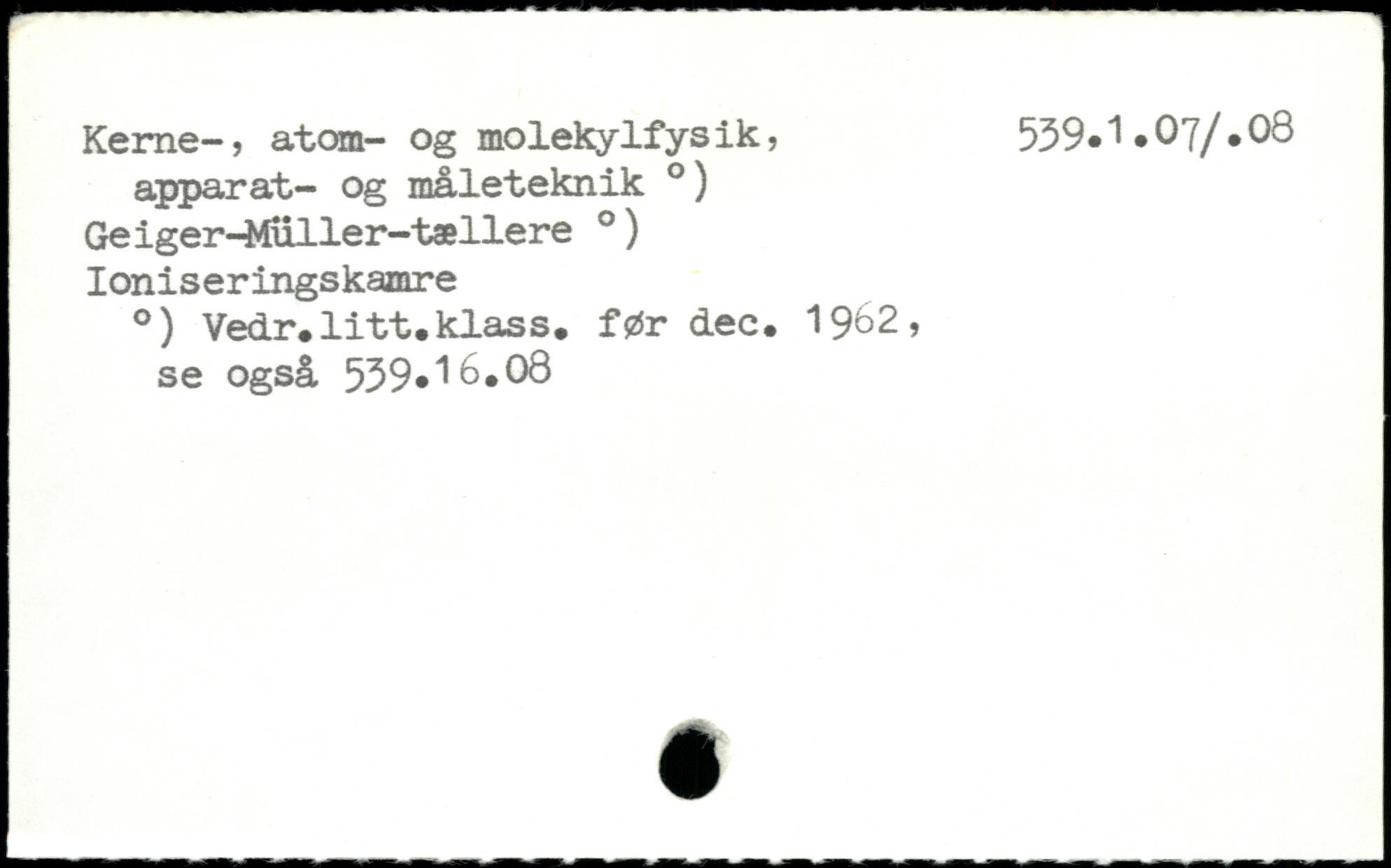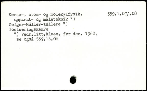 Kerne-, atom- og molekylfysik, 539.I.O7/.O8 apparat- og måleteknik .) Geiger-M1111er-tællere .) Ioniseringskamre .) Vedr.litt.klass. før dec. 19^2, se også 539.16.08