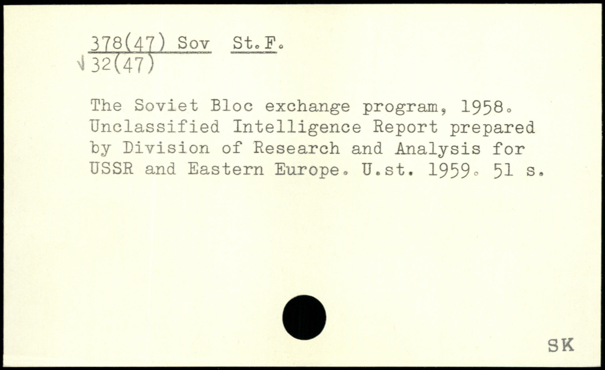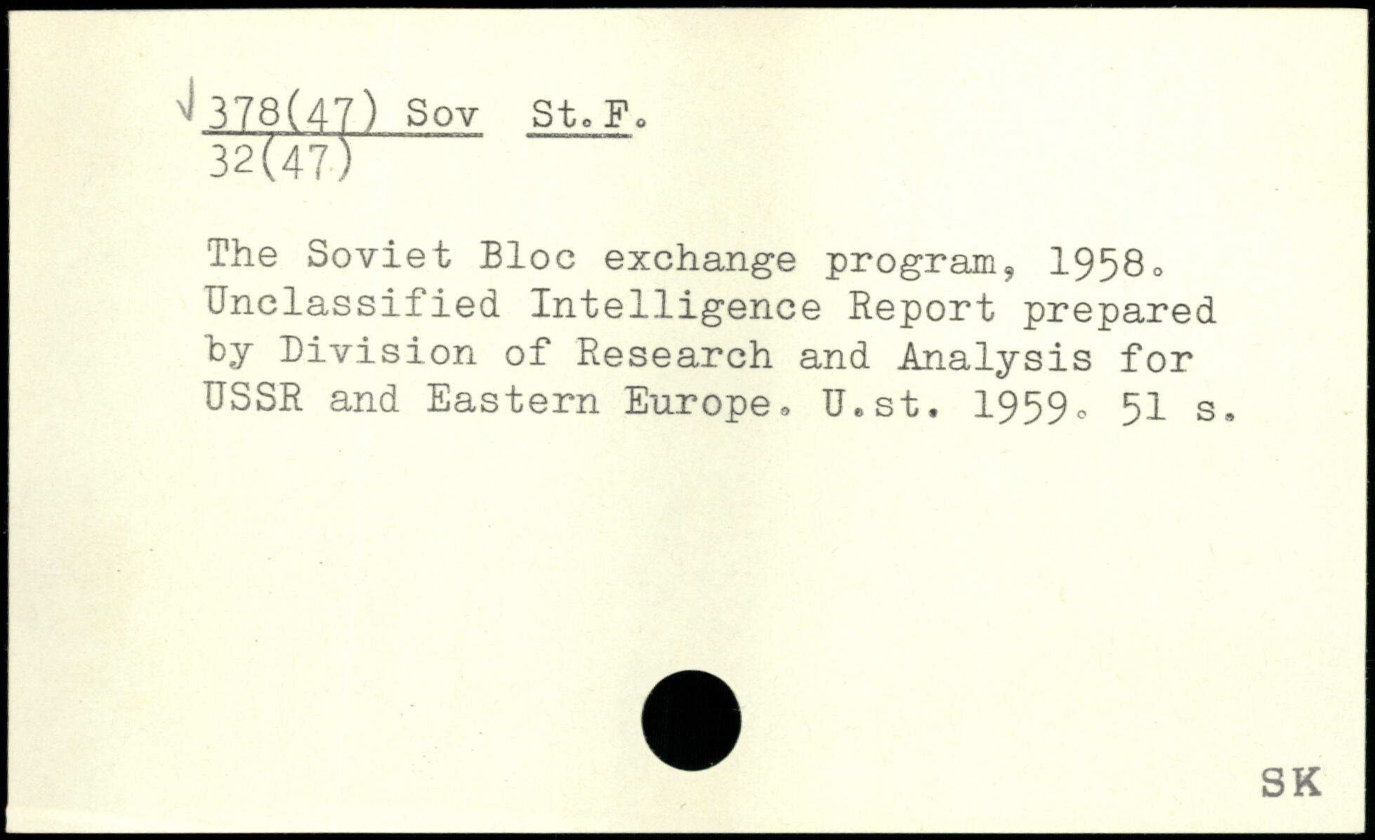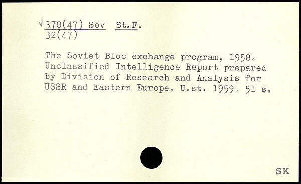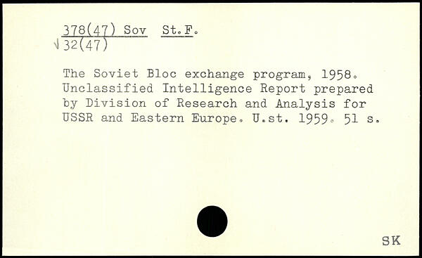 The Soviet Bloc exchange program, 1958. Unclassified Intelligence Report prepared hy Division of Research and Analysis for USSR and Eastern Europe, U.st. 1959.