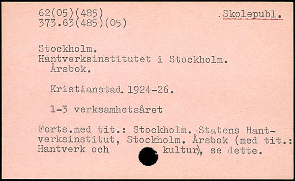 Hantverksinstitutet i Stockholm. Årsbok. Kristianstad. 1924-26. 1-3 verksamhetsåret Ports.med tit.: Stockholm. Statens Hant-verksinstitut, Stockholm. Årsbok (med tit.: Hantverk och kultur), se dette.