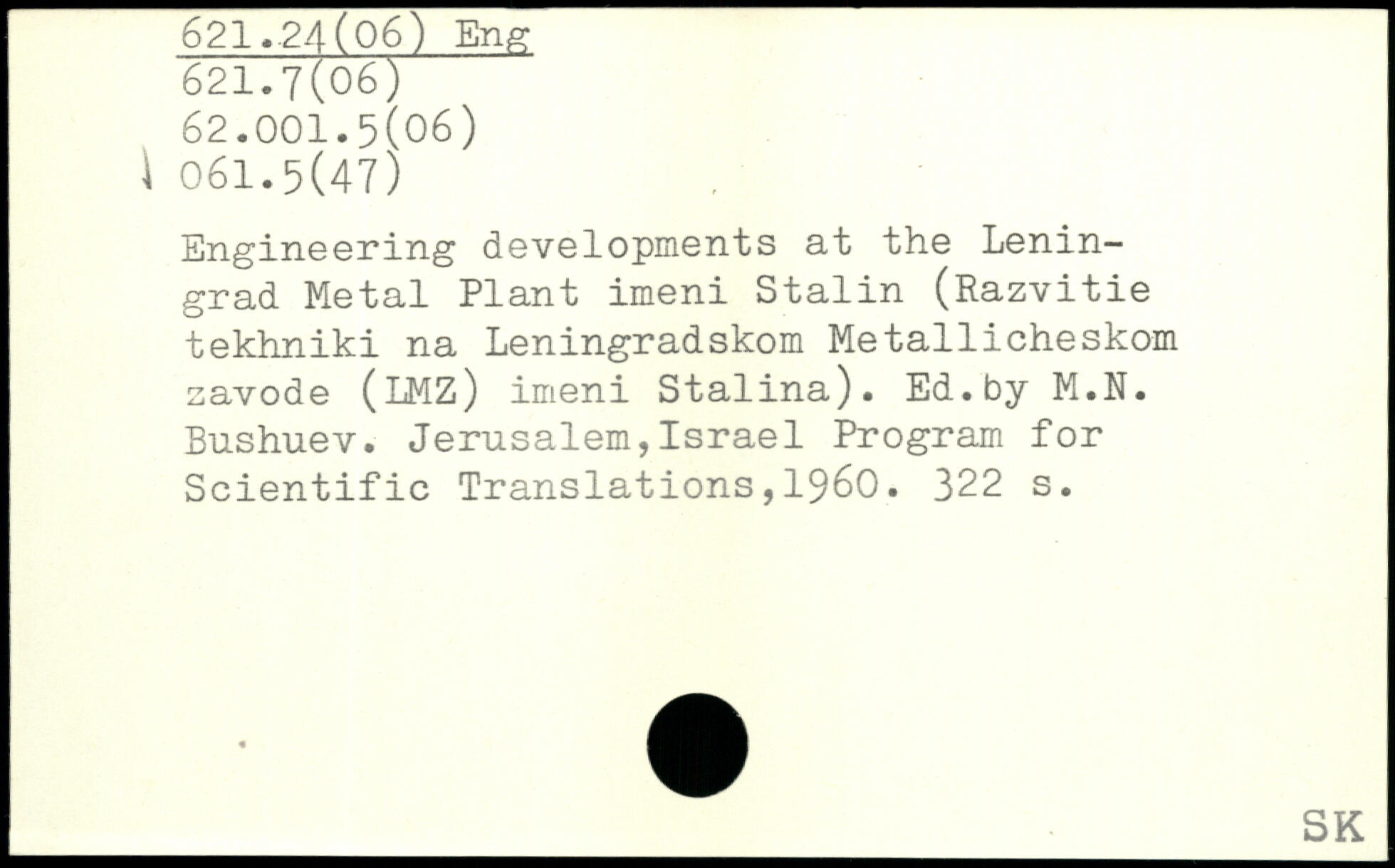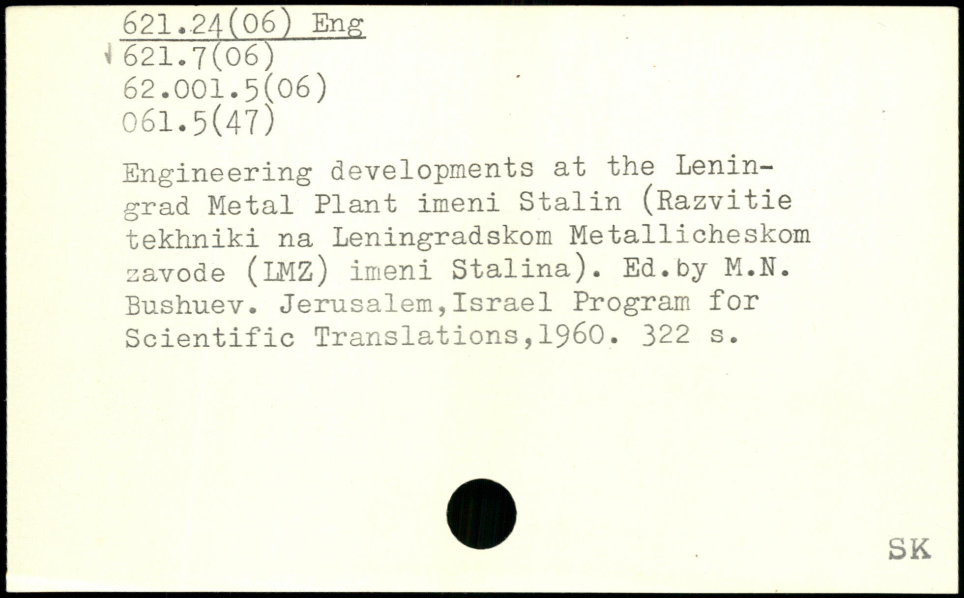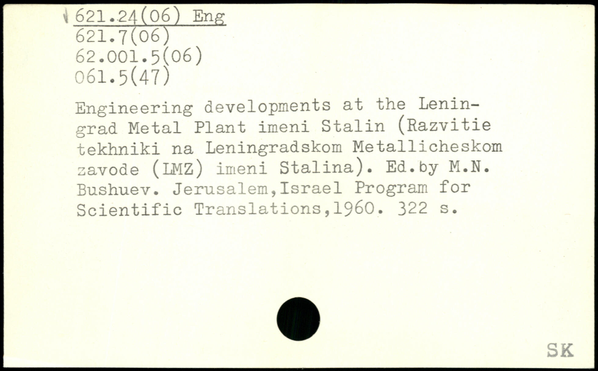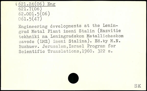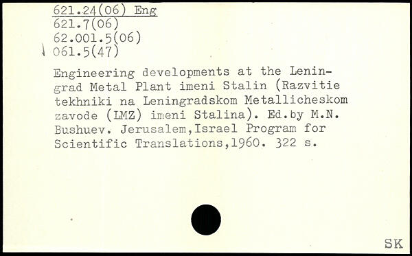 Engineering developments at the Leningrad Metal Plant imeni Stalin (Razvitie tekhniki na Leningradskom Metallicheskom savode (LMZ) imeni Stalina). Ed.by M.N. Bushuev. Jerusalem,Israel Program for Scientific Translations,1960.