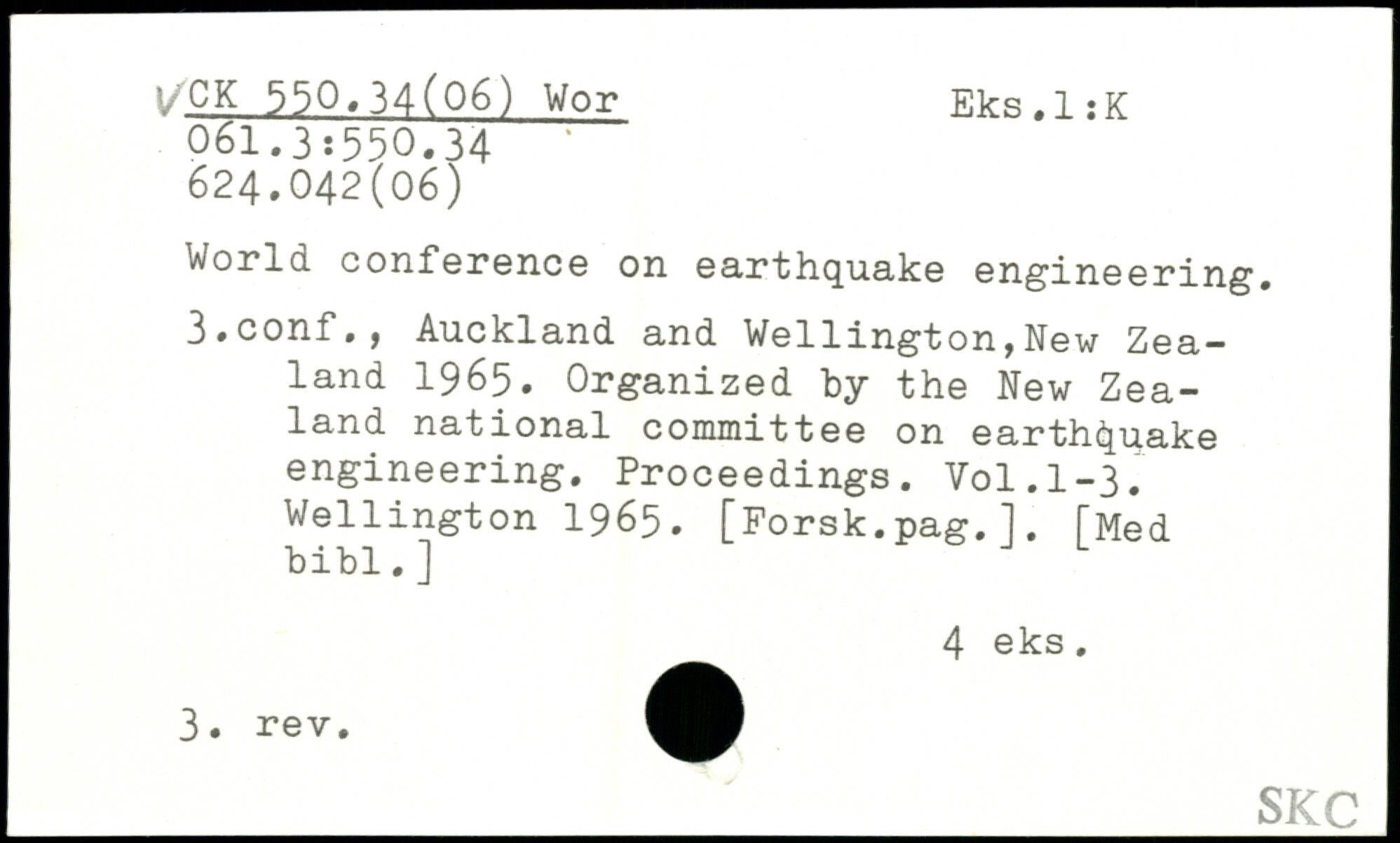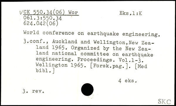 World, conference on earthquake engineering, 3.conf., Auckland and Wellington,New Zealand 1965. Organized hy the New Zealand national committee on earthquake engineering. Proceedings. V0I.I-3. Wellington 1965. [Forsk.pag.1. [Med bibl. ]