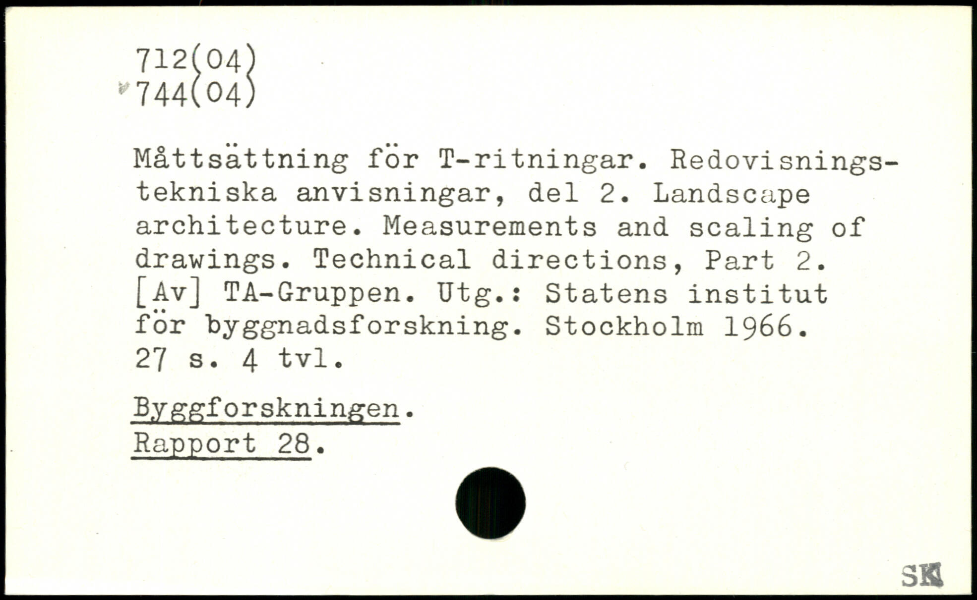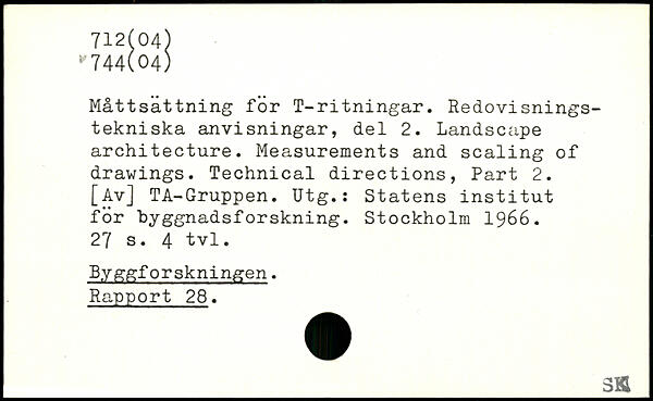Måttsättning för T-ritningar. Redovisnings-tekniska anvisningar, del 2. Landscape architecture. Measurements and scaling of drawings. Technical directions, Part 2. [Av] TA-Gruppen. Utg.: Statens institut för hyggnadsforskning.