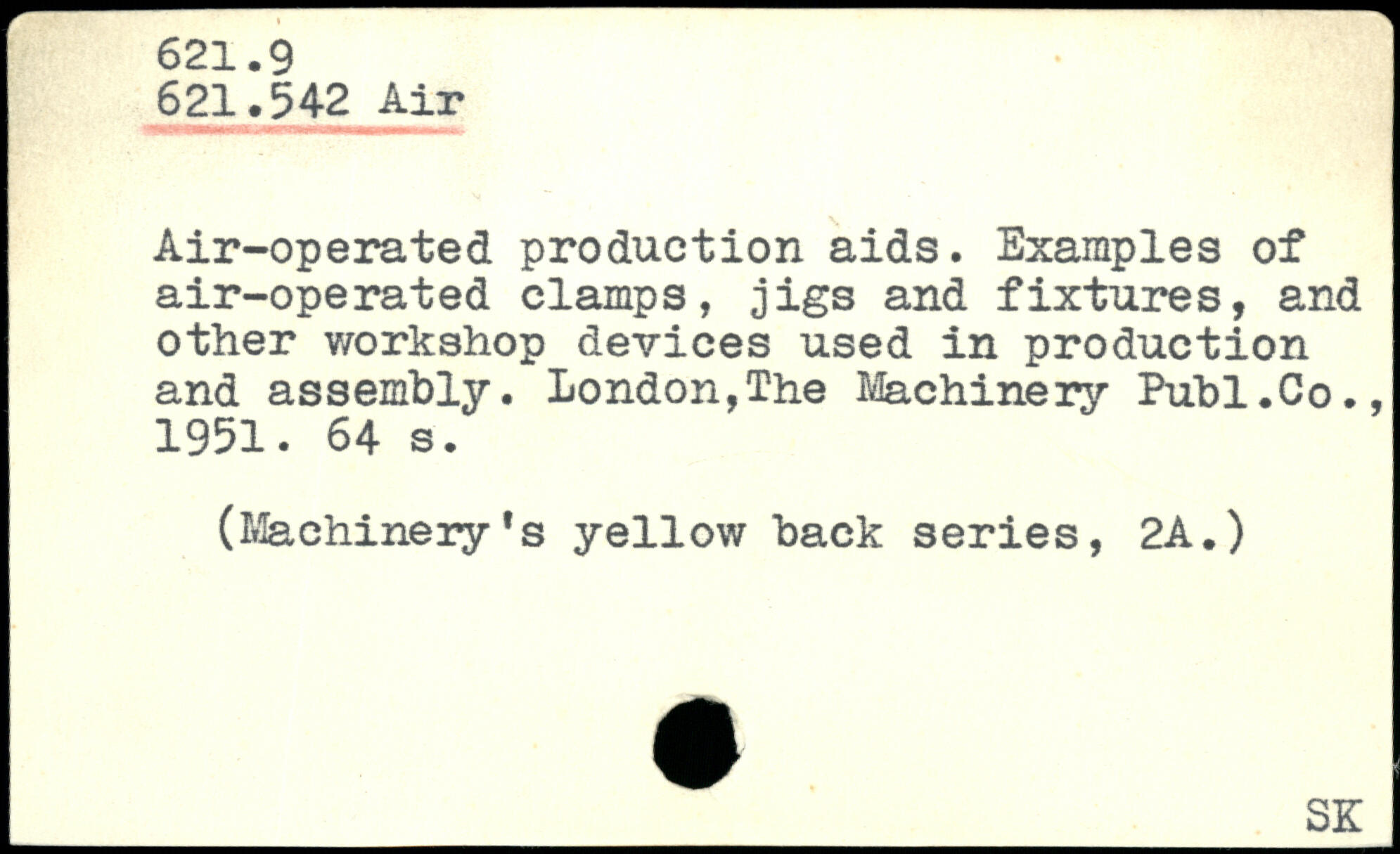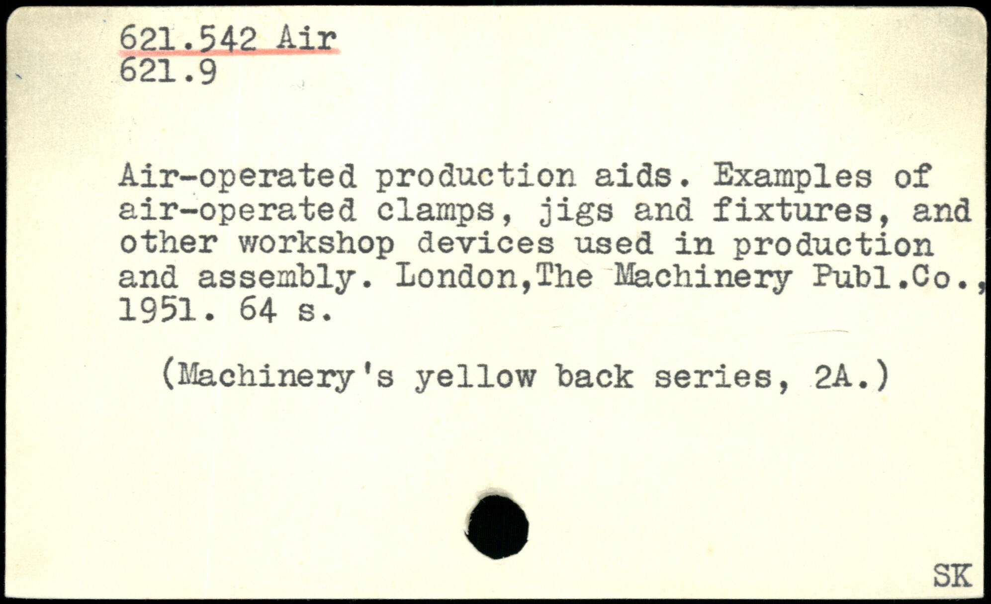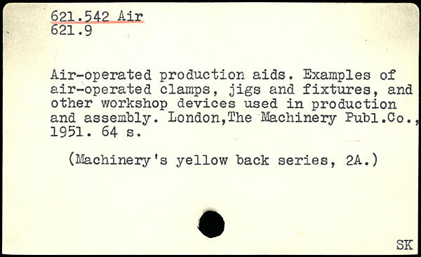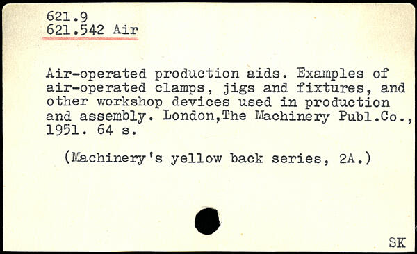 Air-operated production aids. Examples of air-operated clamps, jigs and fixtures, and other workshop devices used in production and assembly. London,The Machinery Publ.Co., 1951.