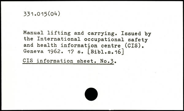 Manual lifting and carrying. Issued by the International occupational safety and health information centre (CIS)