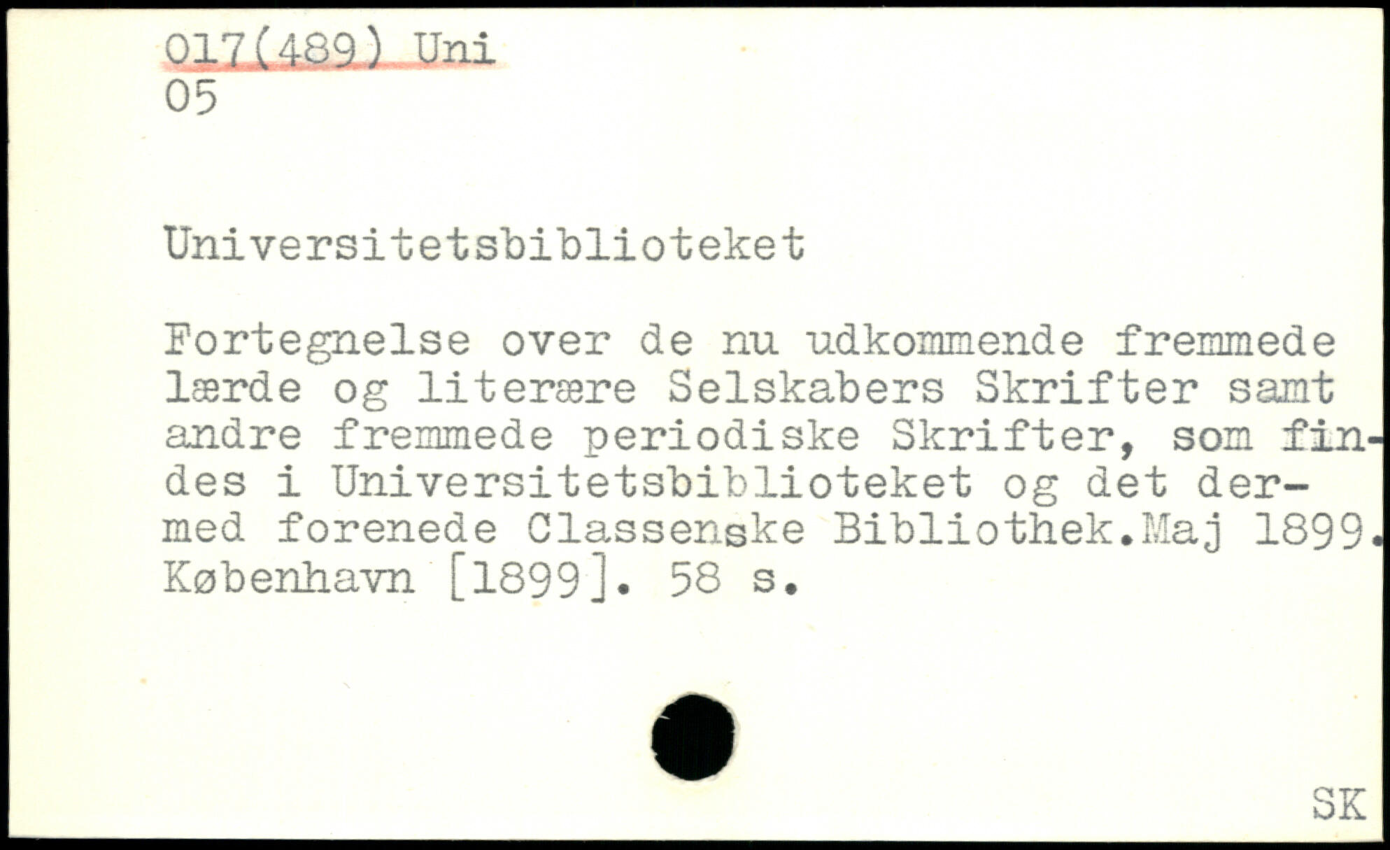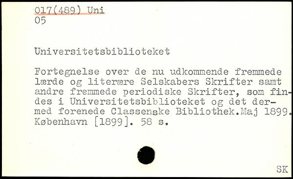 Fortegnelse over de nu udkommende fremmede lærde og literære Selskabers Skrifter samt andre fremmede periodiske Skrifter, som findes i Universitetsbiblioteket og det dermed forenede Classenske Bibliothek.Maj 1899.