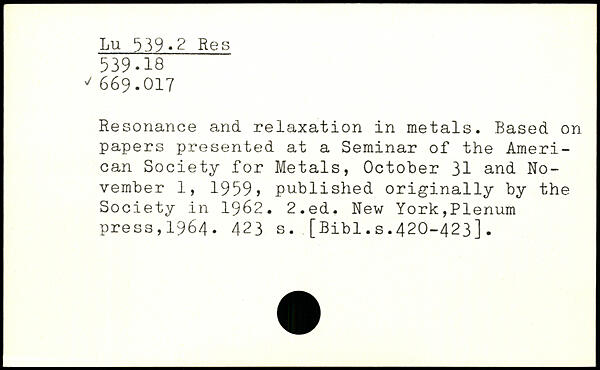 Resonance and relaxation in metals. Based on papers presented at a Seminar of the American Society for Metals, October 31 and November 1, 1959j published originally by the Society in 1962.
