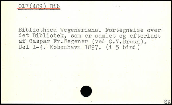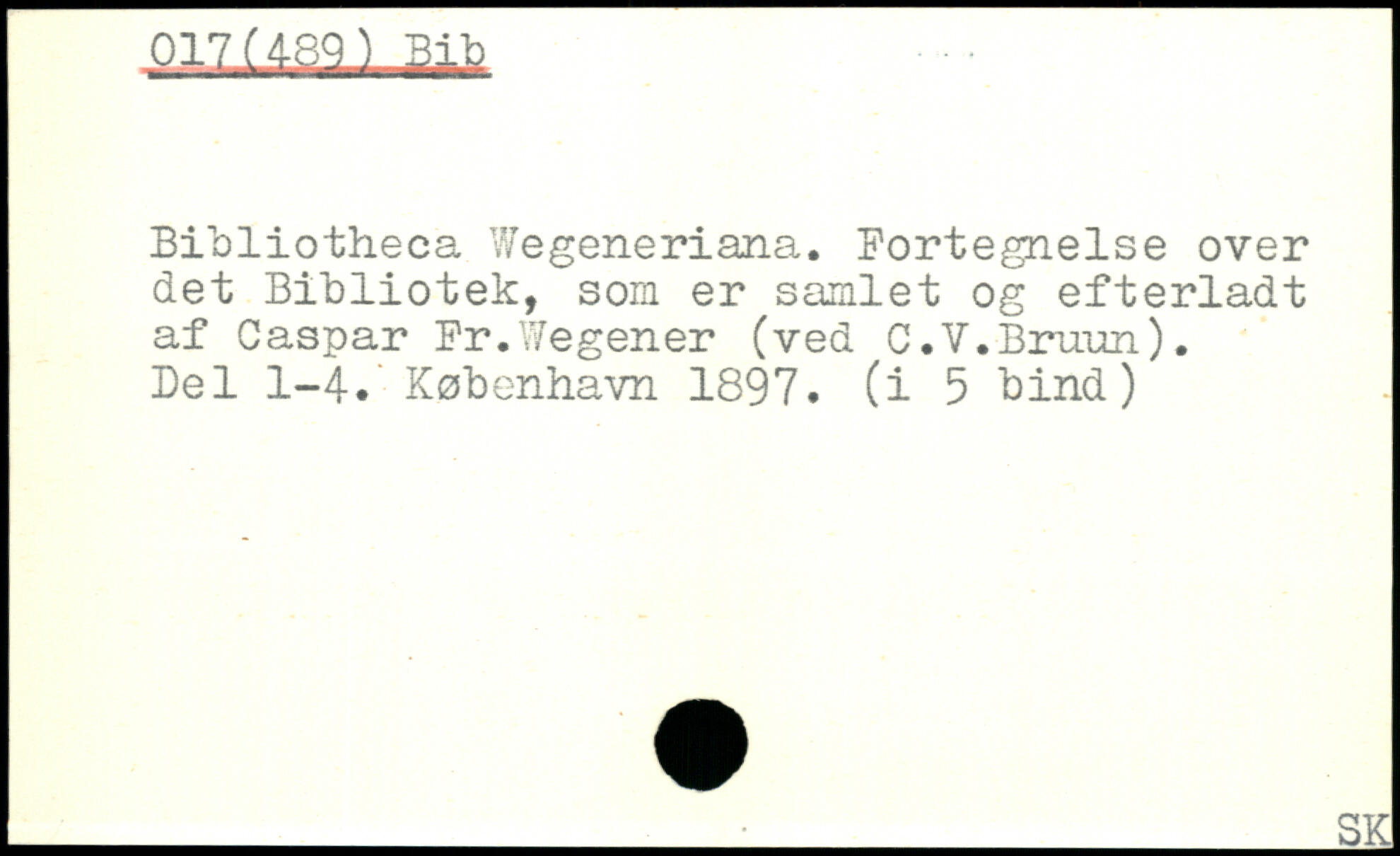 Bibliotheca Wegeneriana. Fortegnelse over det Bibliotek, som er samlet og efterladt af Gaspar Fr.Wegener (ved C.V.Bruun). Bel 1-4.