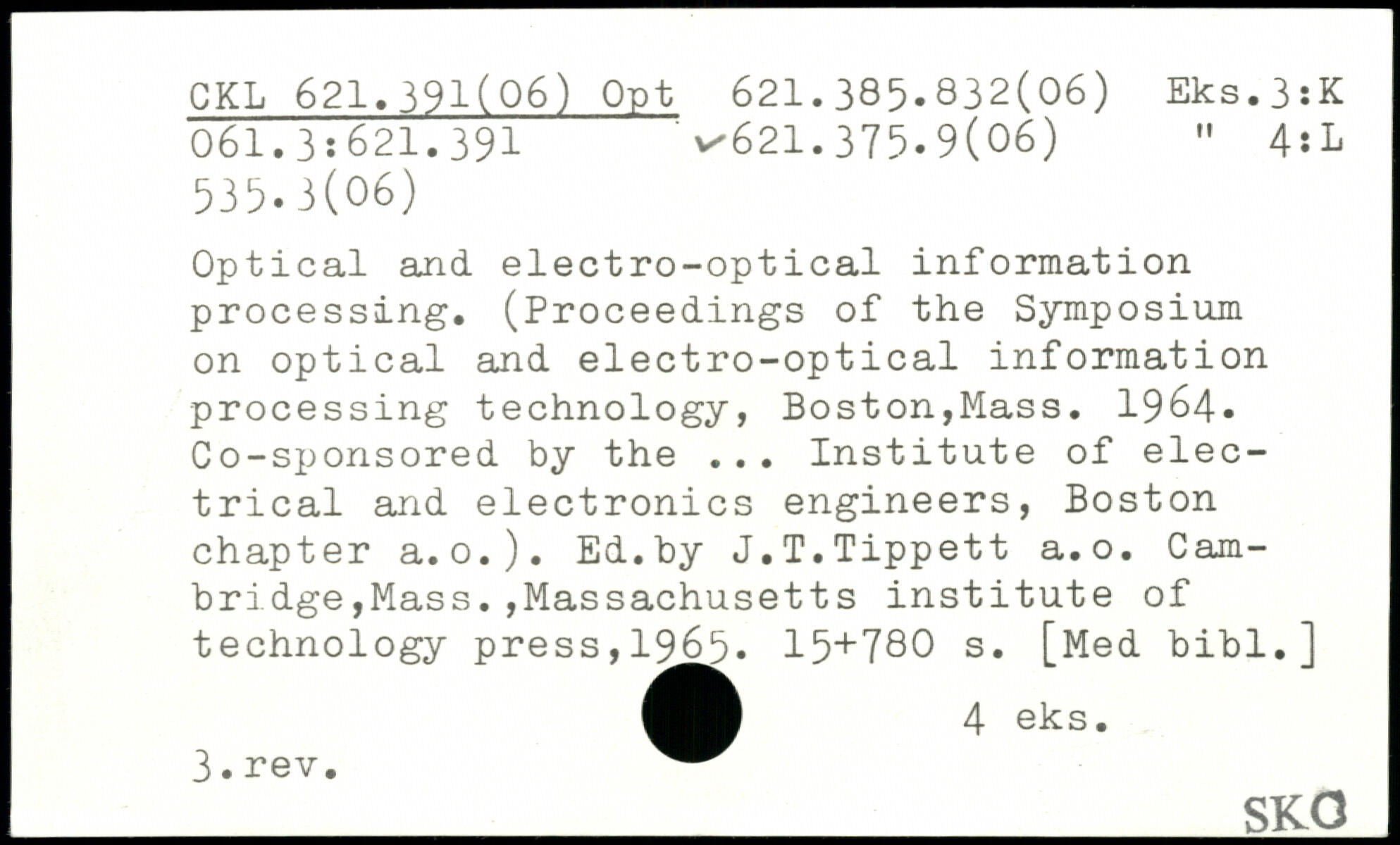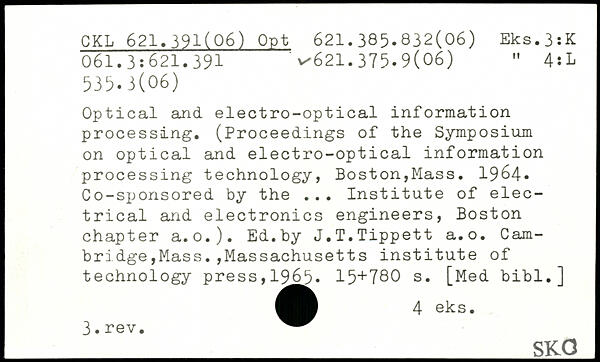 Optical and electro-optical information processing. (Proceedings of the Symposium on optical and electro-optical information processing technology, Boston,Mass. 1964. Co-sponsored by the ... Institute of electrical and electronics engineers, Boston chapter a.o.). Ed.by J.T.Tippett a.o. Cambridge ,Mass. ,Massachusetts institute of technology press,1965.