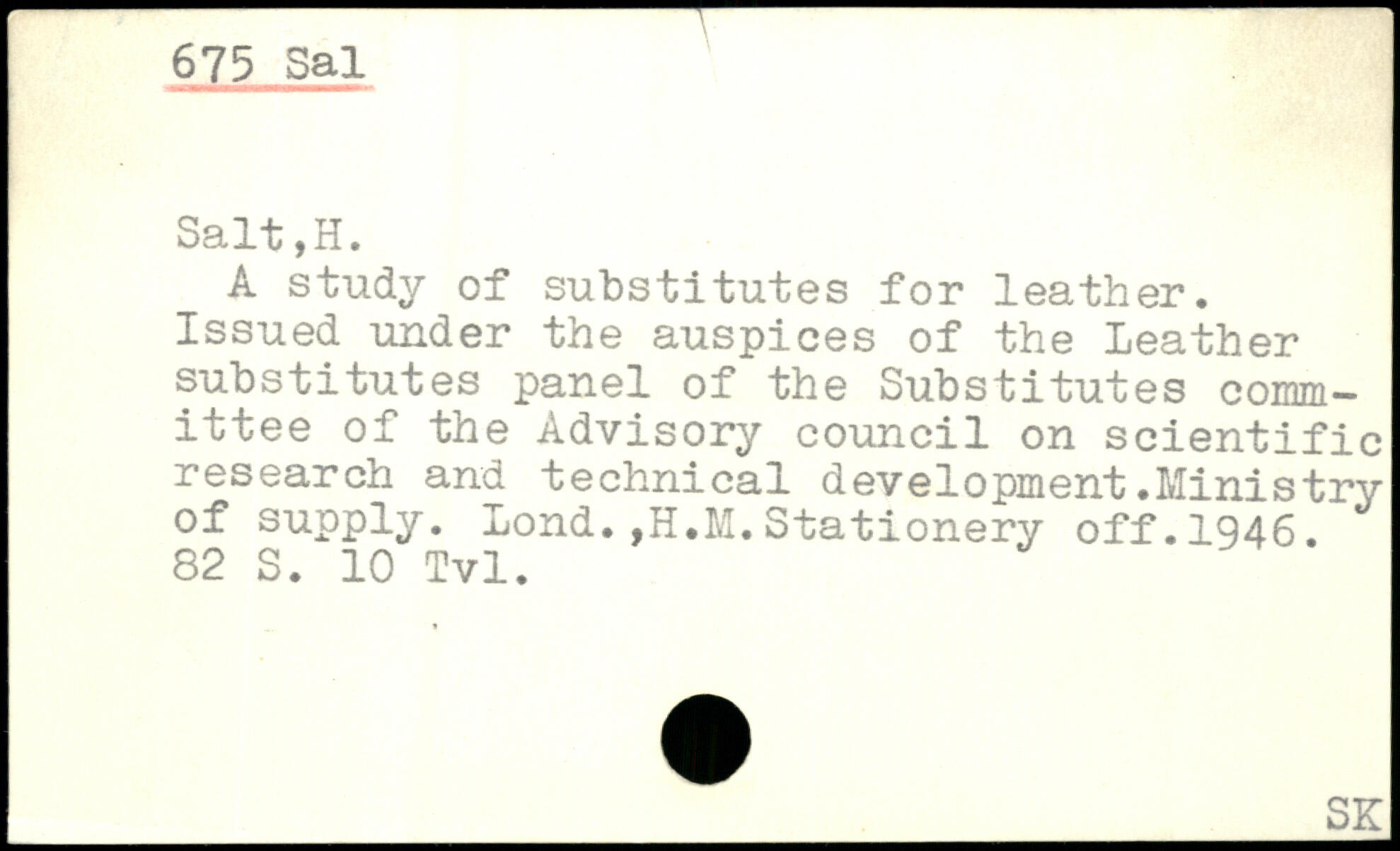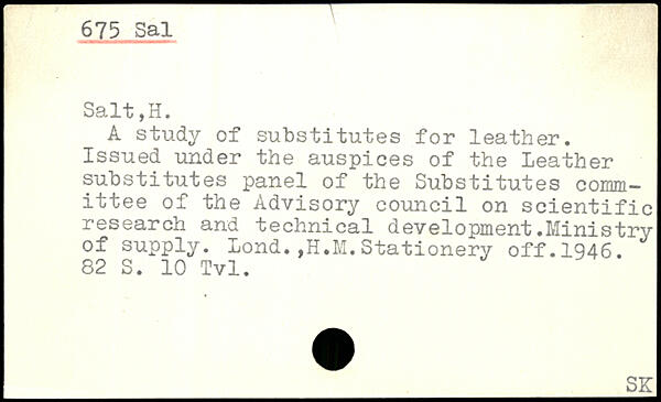 A study of substitutes for leather. Issued under the auspices of the Leather substitutes panel of the Substitutes committee of the Advisory council on scientific research and technical development.Ministry of supply, lond.,H.M.Stationery off.1946.