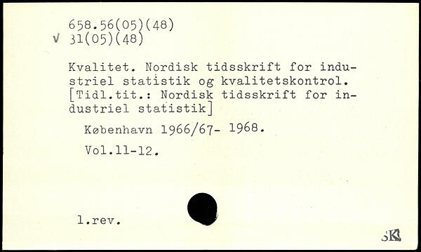 Kvalitet. Nordisk tidsskrift for industriel statistik og kvalitetskontrol. [Tidl.tit.: Nordisk tidsskrift for industriel statistik]