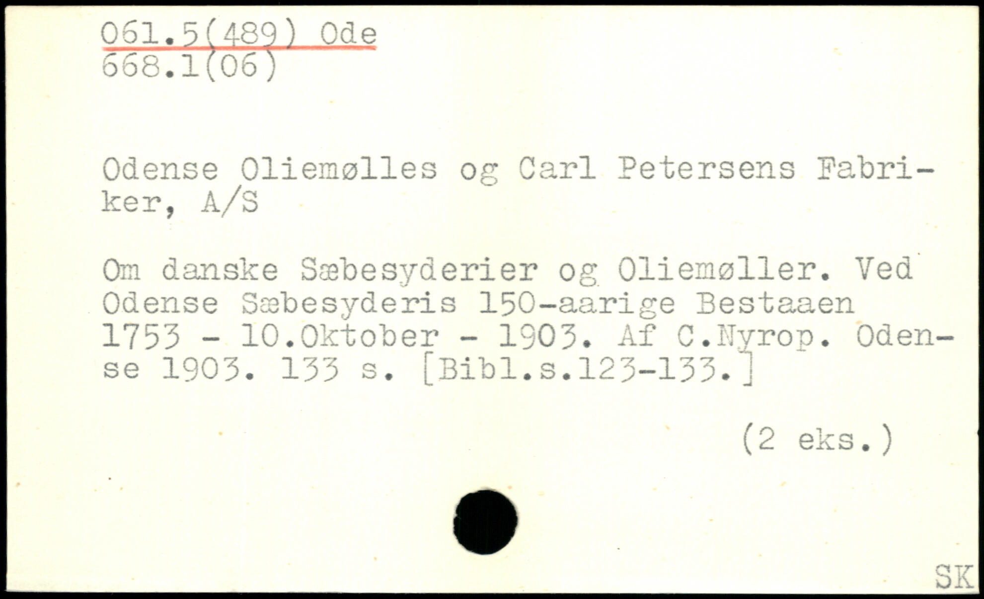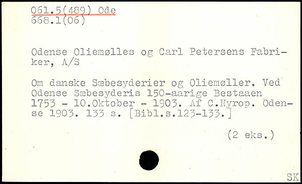 Odense Oliemølles og Carl Petersens Fabriker, A/S Om danske Sæbesyaerier og Oliemøller. Ved Odense Sæbesyderis 150-aarige Bestaaen 1753 - 10.Oktober - 1903. Af C.Nyrop. Odense 1903.