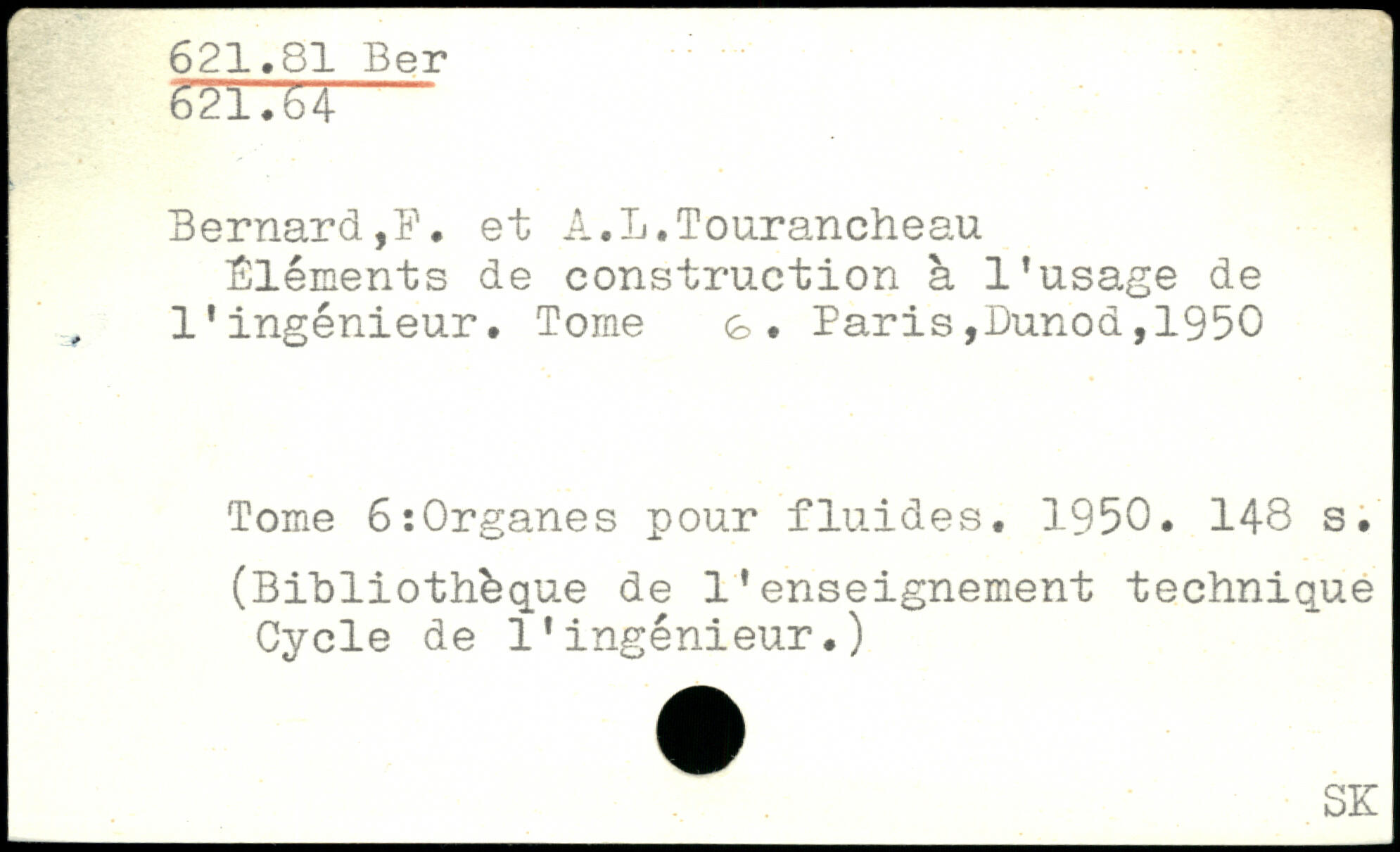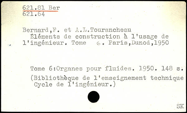 Bernard,?, et Â.L.Tourancheau Éléments de construction à l'usage de l'ingénieur. Tome g. Paris,I)unod,1950 Tome 6:0rganes pour fluides, 1950.