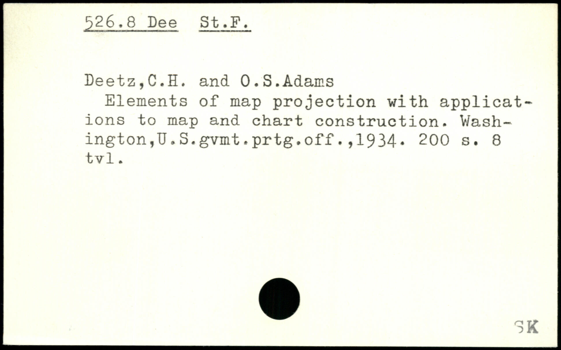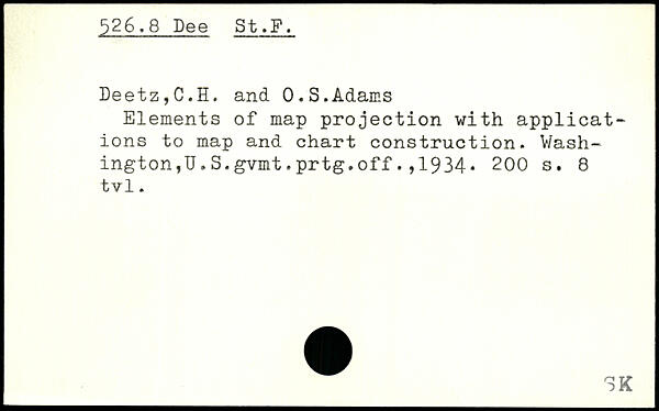 Deetz,C.H. and 0.S.Adams Elements of map projection with applications to map and chart construction. Washington ,U. S. gvmt. prtg. off ., 1934.