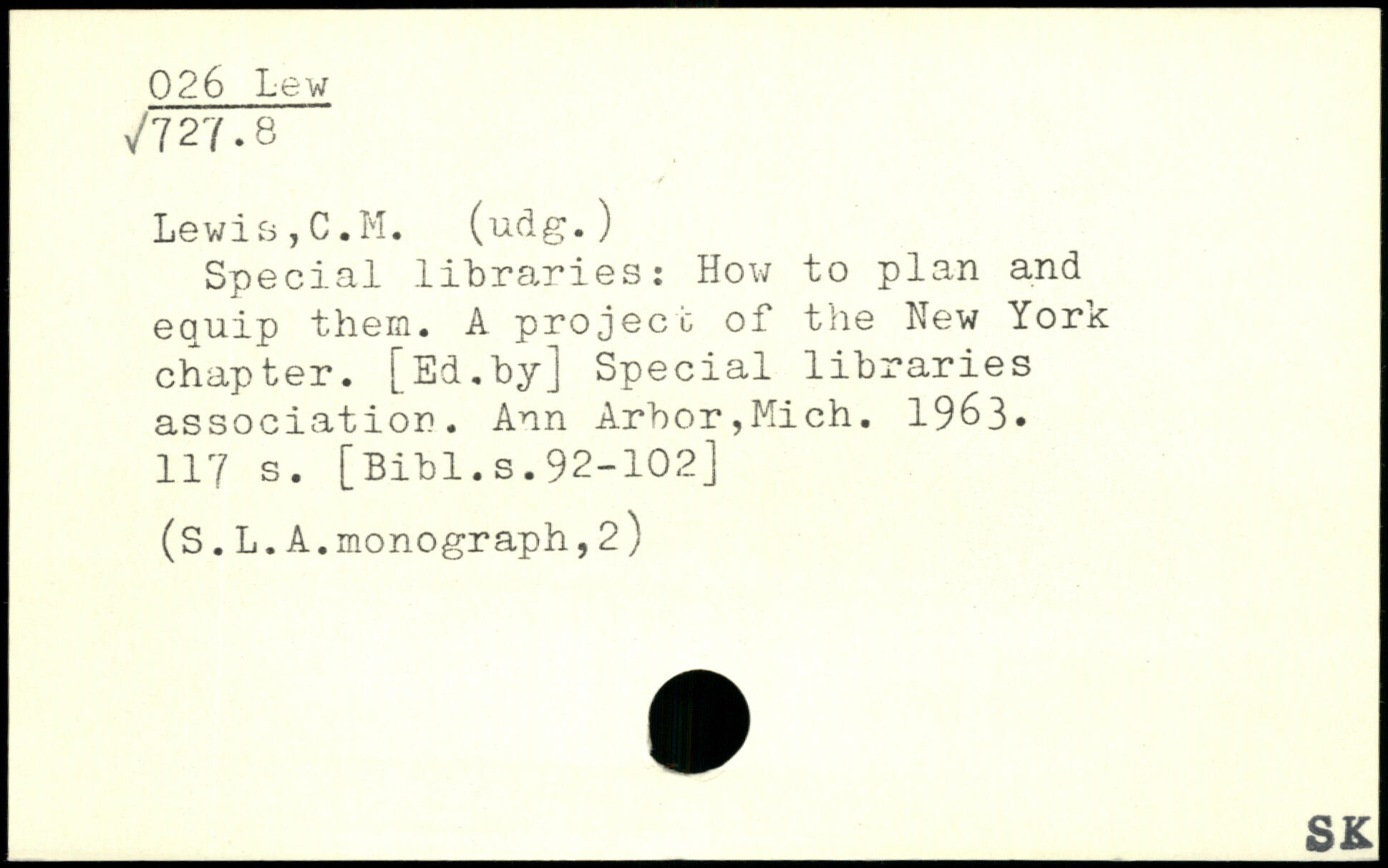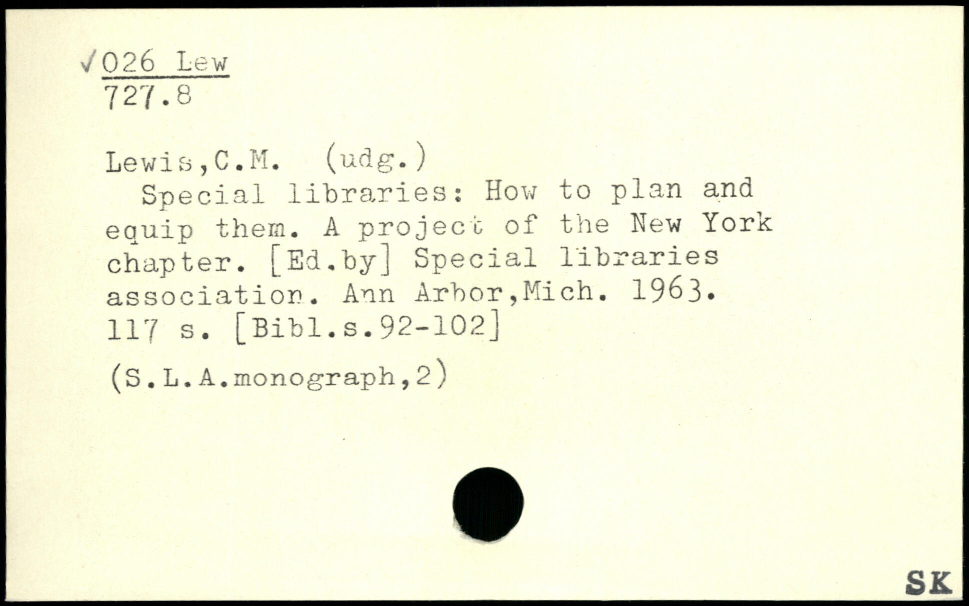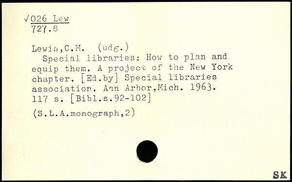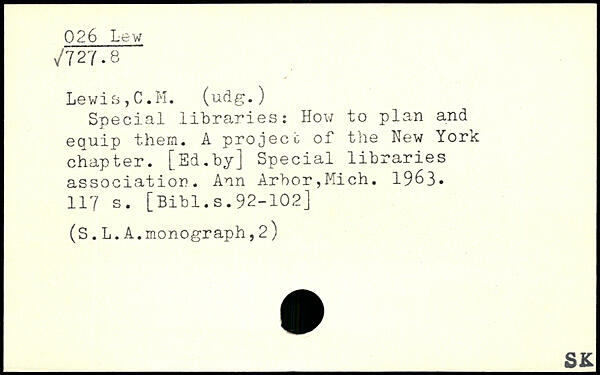 Special libraries: How to plan and equip them. A project of the New York chapter. [Ed.by] Special libraries association. Ann Arbor,Mich. 1963.