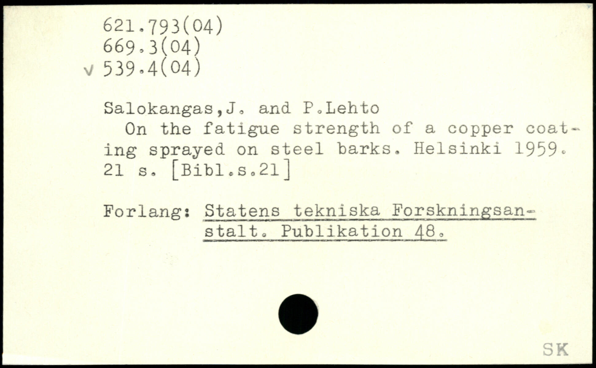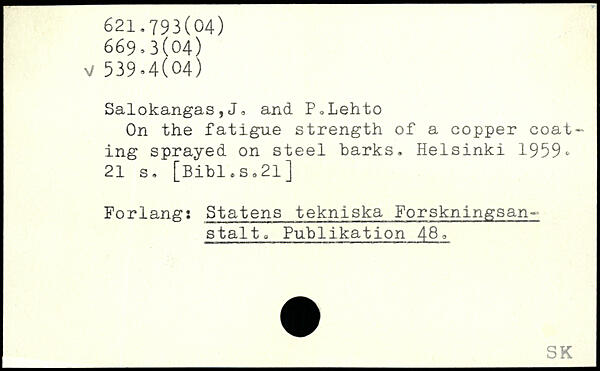 Salokangas,J, and P.Lehto On the fatigue strength of a copper coating sprayed on steel barks.