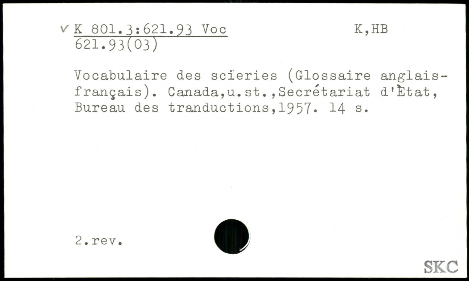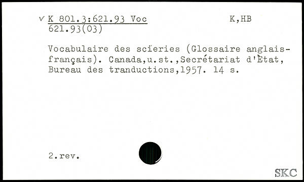 Vocabulaire des scieries (Glossaire anglais-français). Canada,u.stSecretariat d’Ètat, Bureau des tranductions,1957