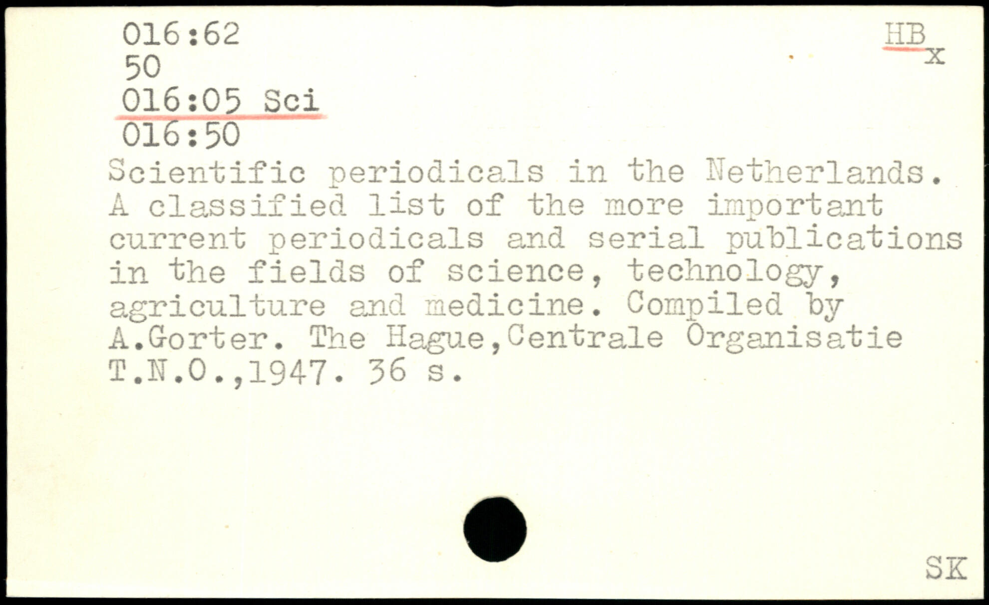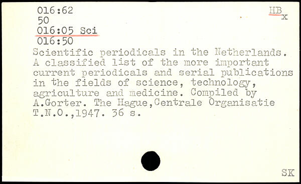 Scientific periodicals in the Netherlands. A classified list of the more important current periodicals and serial publications in the fields of science, technology, agriculture and medicine. Compiled by A.Sorter. The Hague,Centrale Organisatie T.N.O.,1947.