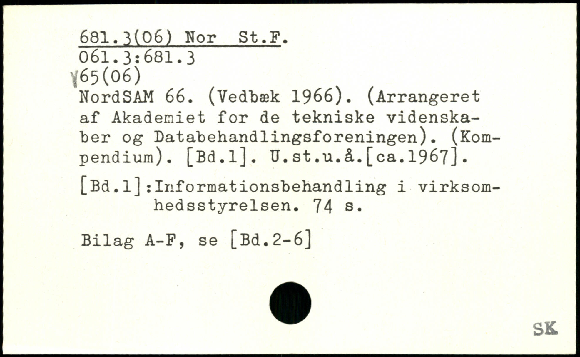 NordSAM 66. (Vedbæk 1966). (Arrangeret af Akademiet for de tekniske videnskaber og Databehandlingsforeningen). (Kompendium). [Bd.l], U.st.u.å.[ca.1967].