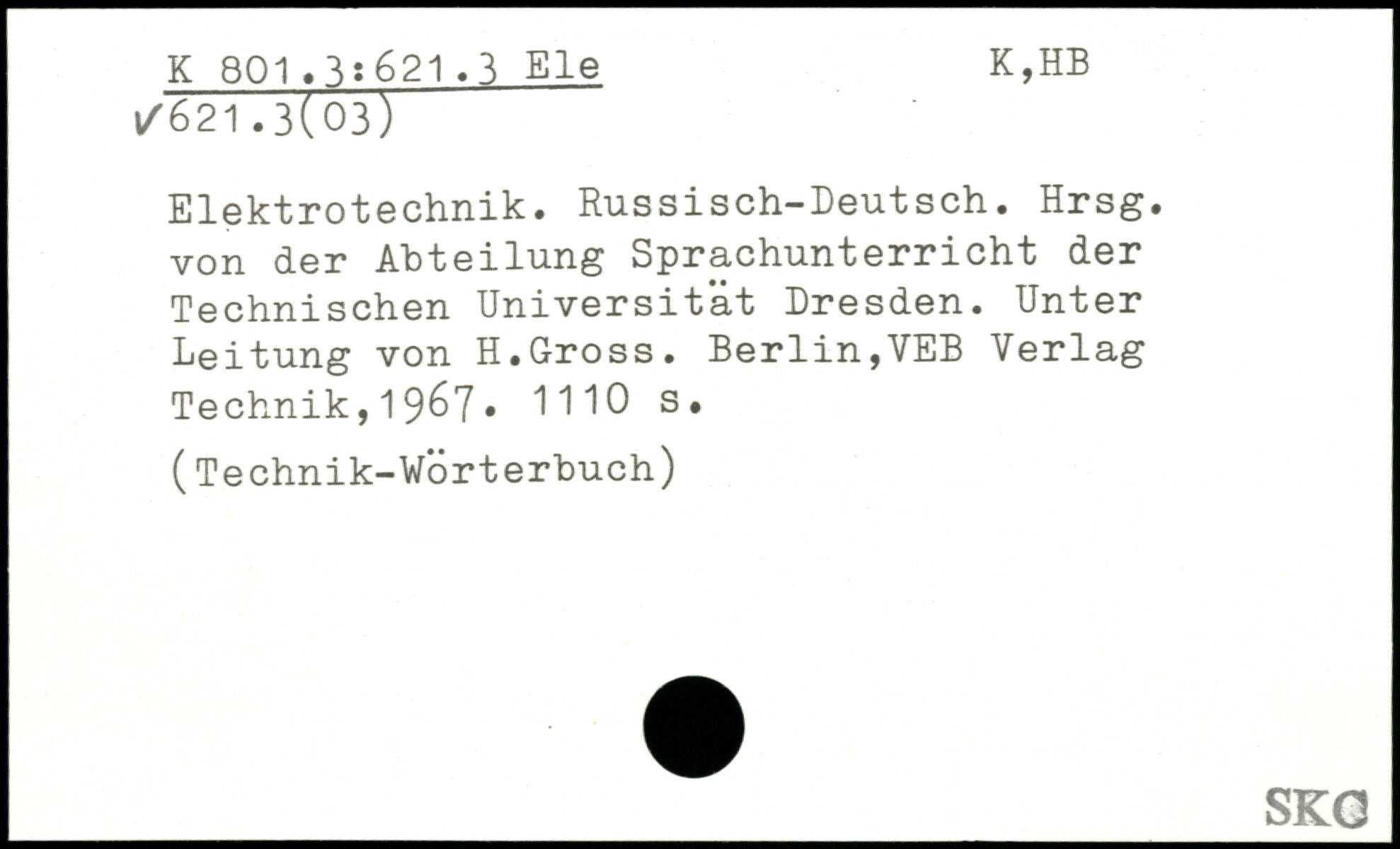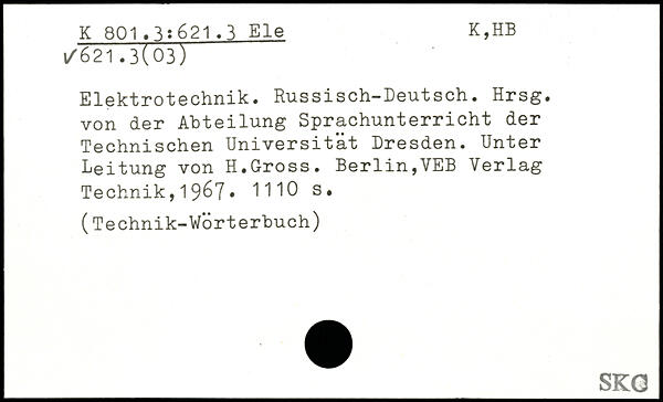 Elektrotechnik. Russisch-Deutsch. Hrsg, von der Abteilung Sprachunterricht der Technischen Universität Dresden. Unter Leitung von H.Gross. Berlin,VEB Verlag Technik,19^7.
