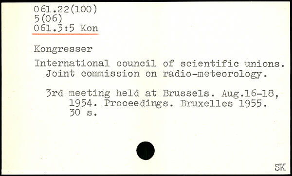061.5:5 Kon Kongresser International council of scientific unions. Joint commission on radio-meteorology. 3rd meeting held at Brussels. Aug.16-18, 1954. Proceedings.
