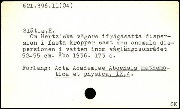 Om Hertz.ska vågors ifrågasatta dispersion i fasta kroppar samt den anomala dispersionen i vatten inom våglangdsområdet 52-55 cm. Åbo 1936.