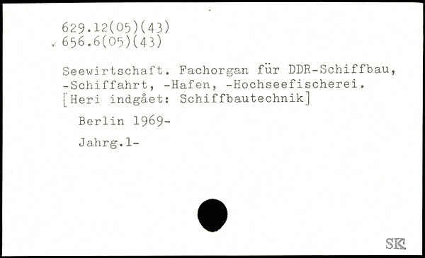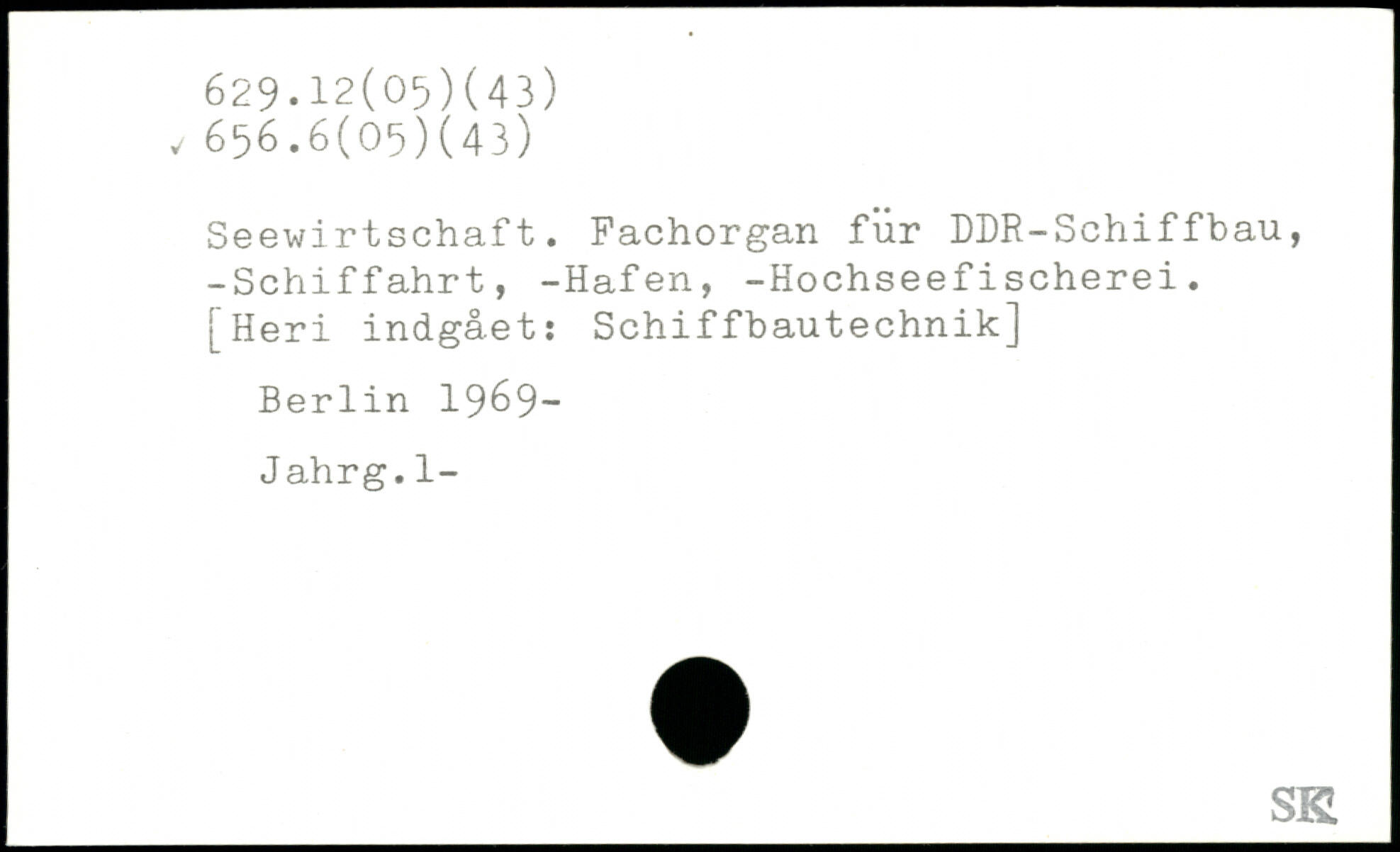 Seewirtschaft. Fachorgan für DDR-Schiffbau, -Schiffahrt, -Hafen, -Hochseefischerei. [Heri indgået: Schiffbautechnik] Berlin 19&9” Jahrg.1-