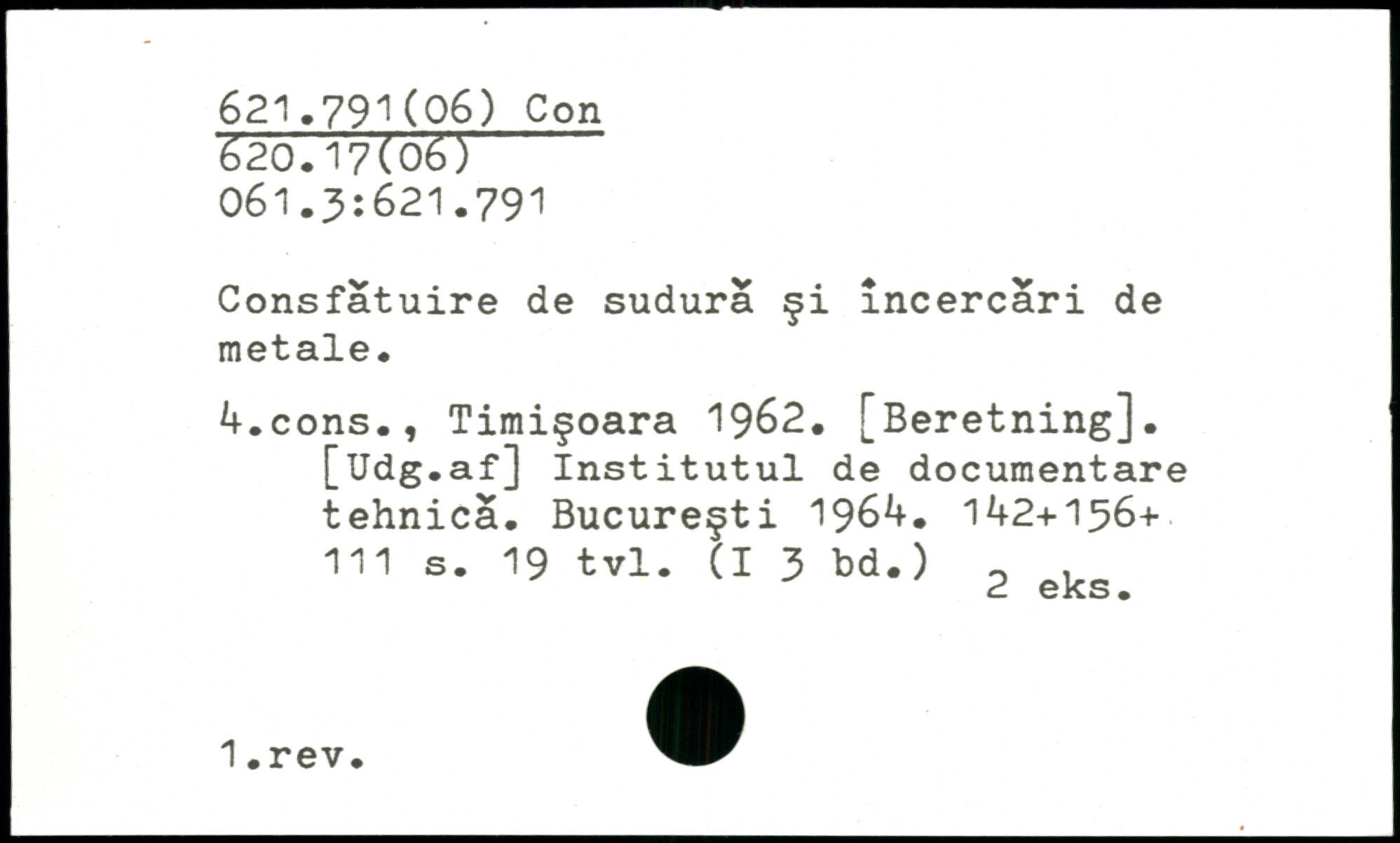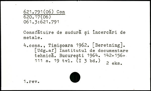 Consfatuire de sudura çi încercari de metale. k,cons., Timiçoara 1962. [Beretning]. [Udg.af] Institutul de documentare tehnica. Bucureçti 196^. 1^2+156+ j