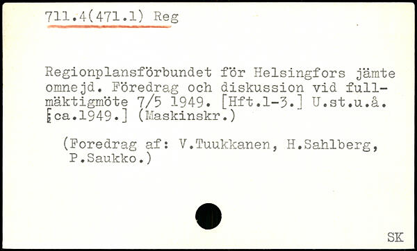 Regionplansforbundet för Helsingfors jämte omnejd. Föredrag och diskussion vid fullmakt igmö te 7/5 1949. [Hft.1-3.] U.st.u.å. I ca.1949.] (Maskinskr.)