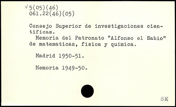 Consejo Superior de investigaciones eien-tificas o Memoria del Patronato "Alfonso el Sabio" de matematicas, fisica y quimica.