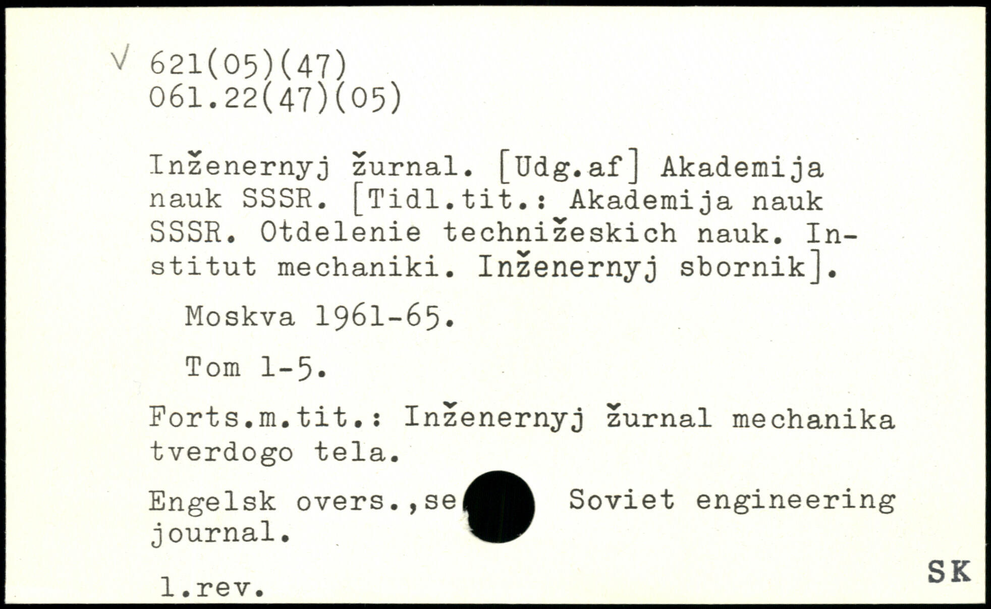 Inzenernyj zurnal. [Udg.af] Akademija nauk SSSH. [Tidl.tit.î Akademija nauk SSSR. Otdelenie technizeskich nauk. Institut mechaniki. Inzenernyj sbornik].