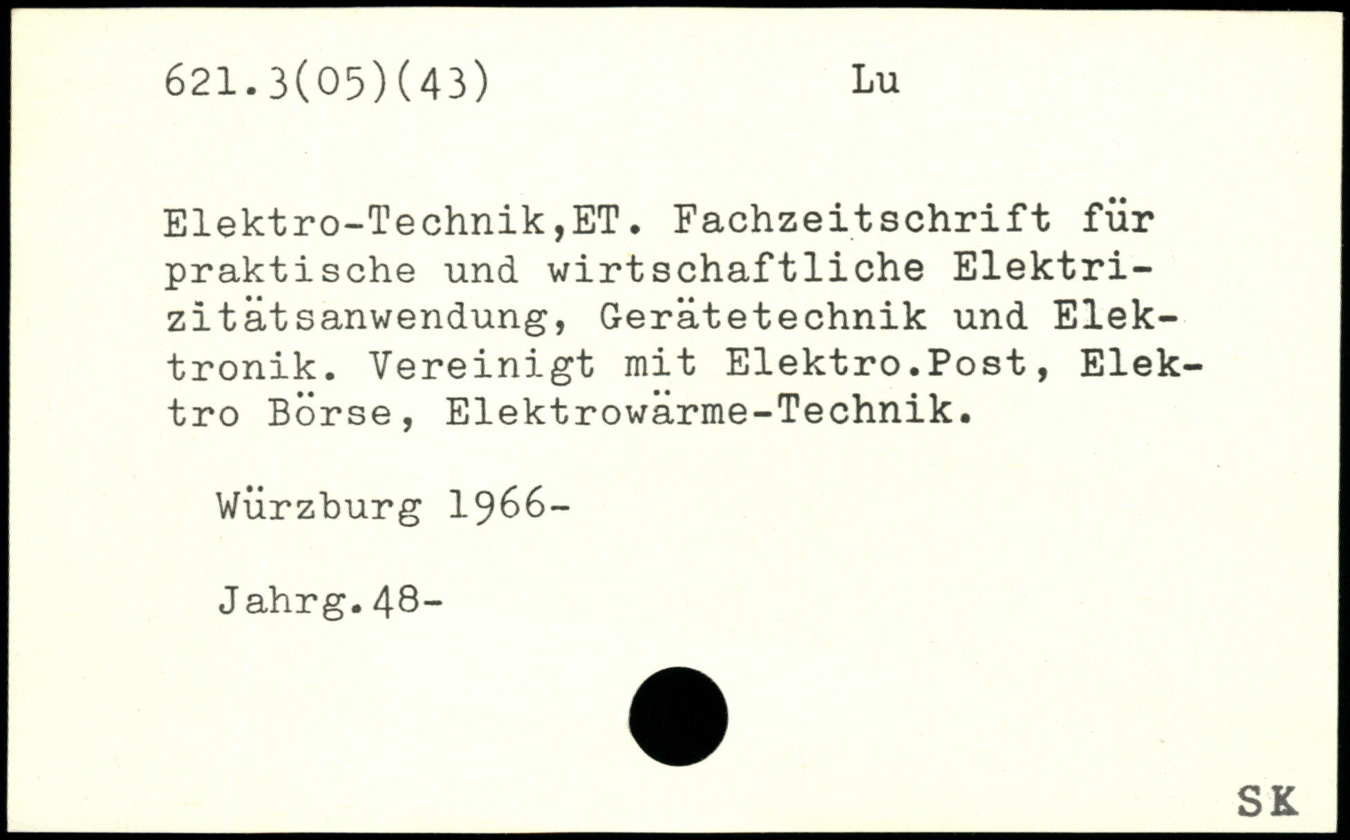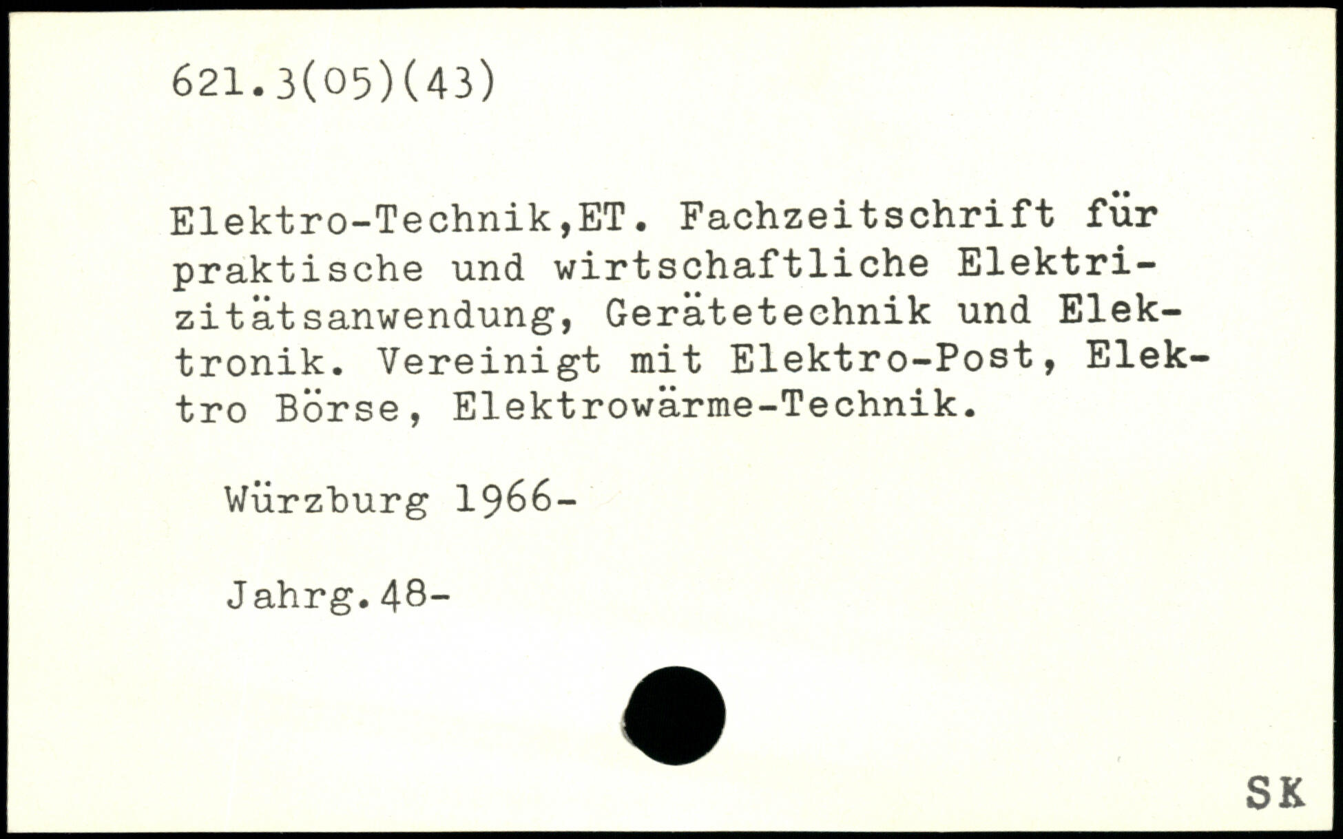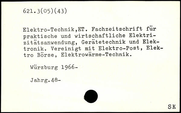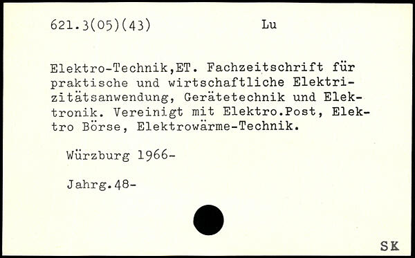 Elektro-Technik,ET. Fachzeitschrift für praktische und wirtschaftliche Elektrizität sanwendung, Gerätetechnik und Elektronik. Vereinigt mit Elektro.Post, Elektro Börse, Elektrowärme-Technik. Würzburg 1966- Jahrg.48-