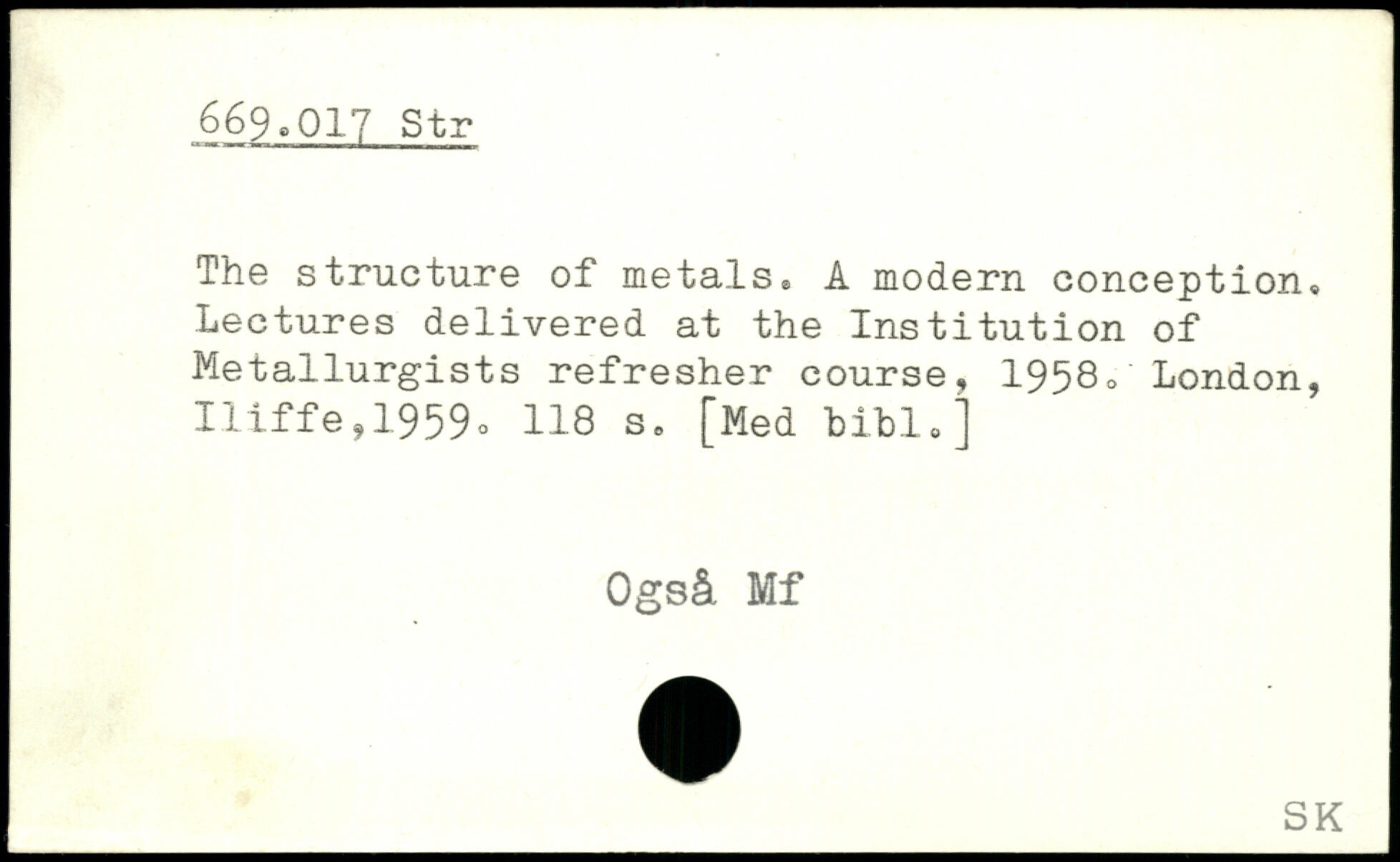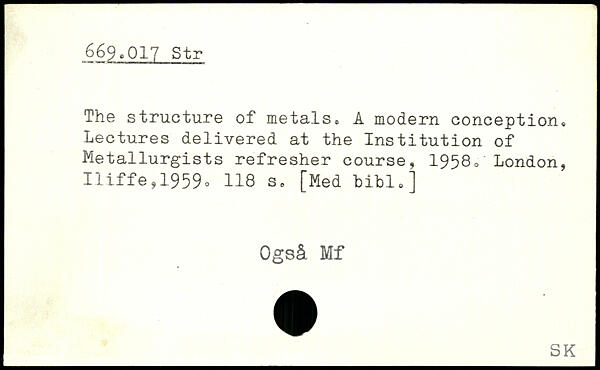 The structure of metals, A modern conception. Lectures delivered at the Institution of Metallurgists refresher course, 19580 London, Iliffe.1959.