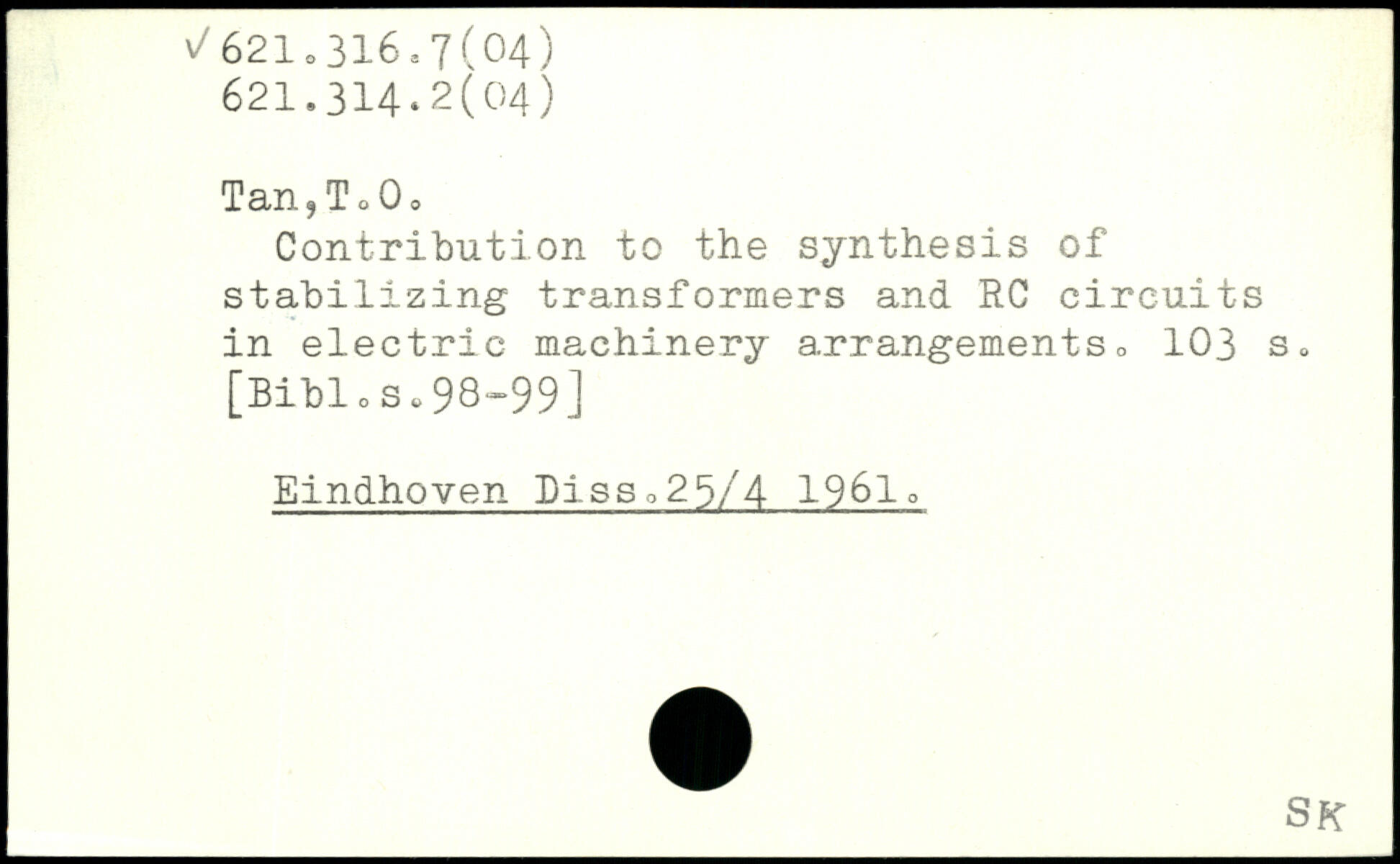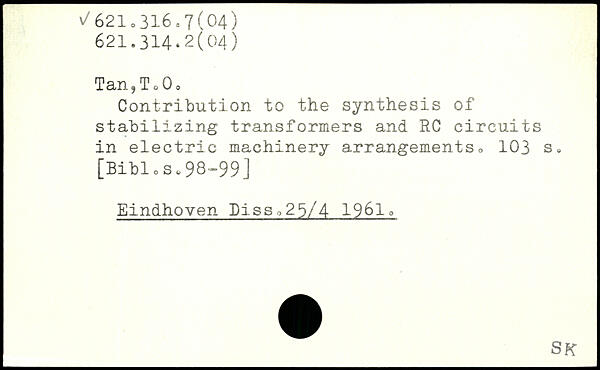 Tan,To 0, Contribution to the synthesis of stabilizing transformers and RC circuits in electric machinery arrangements