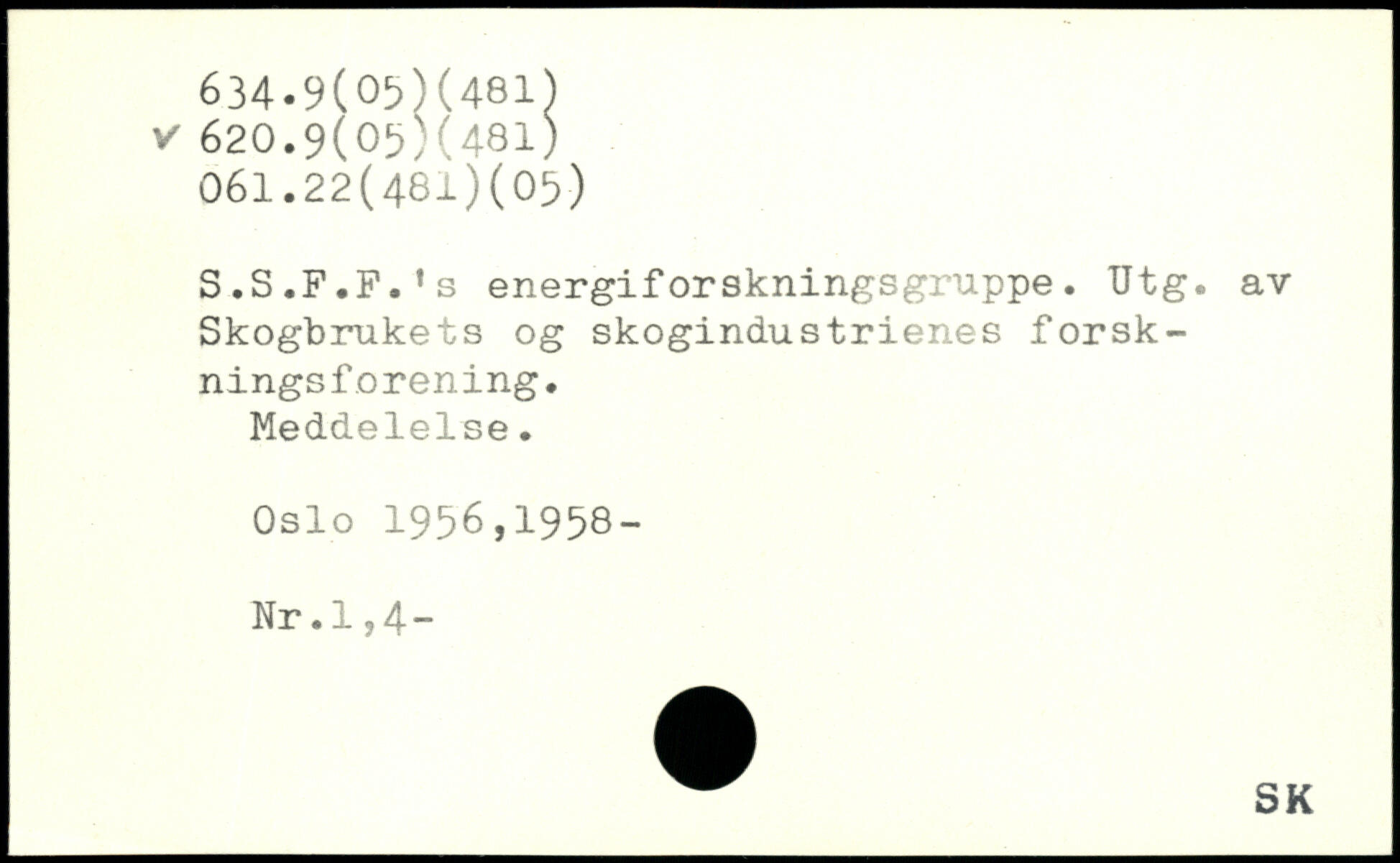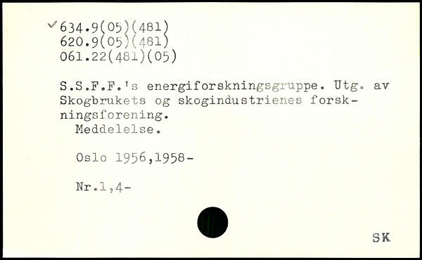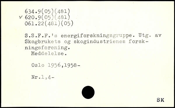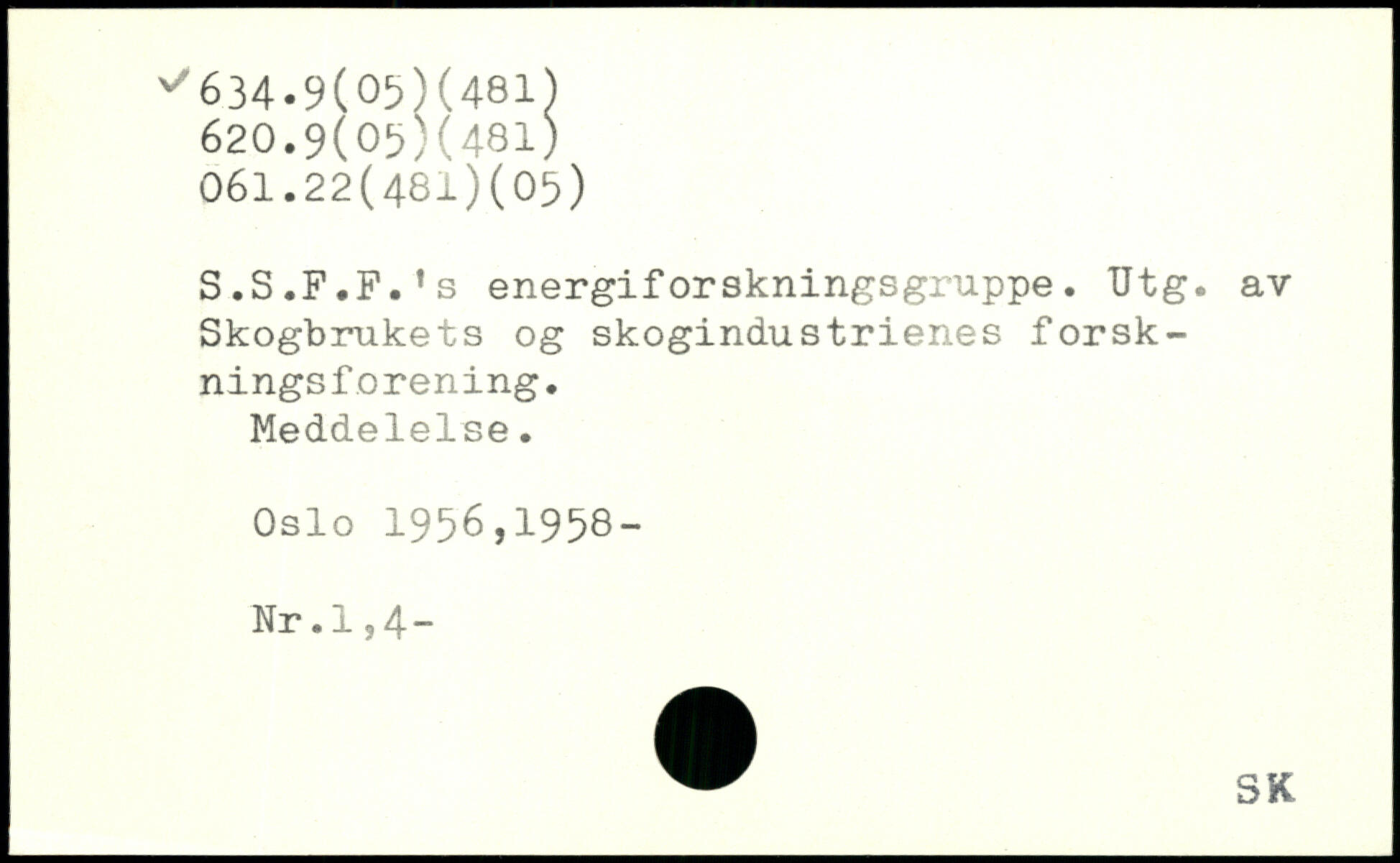S.S.F.F.’s energiforskningsgruppe. Utg. av Skogbrukets og skogindustrienes forskningsf orening. Meddelelse. Oslo 1956,1958- Nr.1,4-