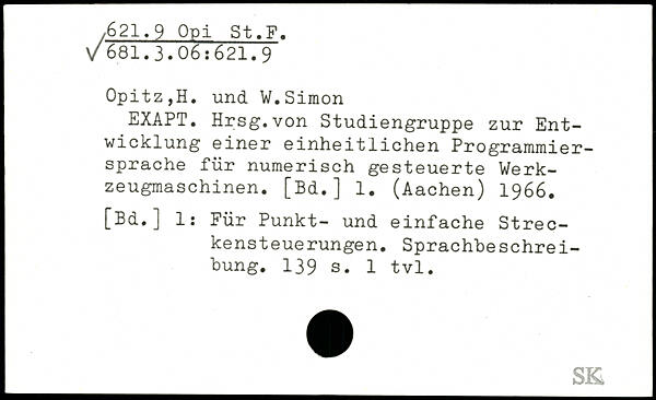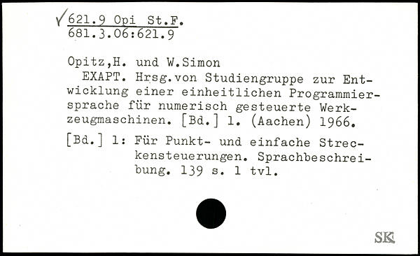 EXAPT. Hrsg.von Studiengruppe zur Entwicklung einer einheitlichen Programmiersprache für numerisch gesteuerte Werkzeugmaschinen. [Bd.] 1. (Aachen) 1966. [Bd.] 1: Für Punkt- und einfache Streckensteuerungen. Sprachbeschrei-bung.