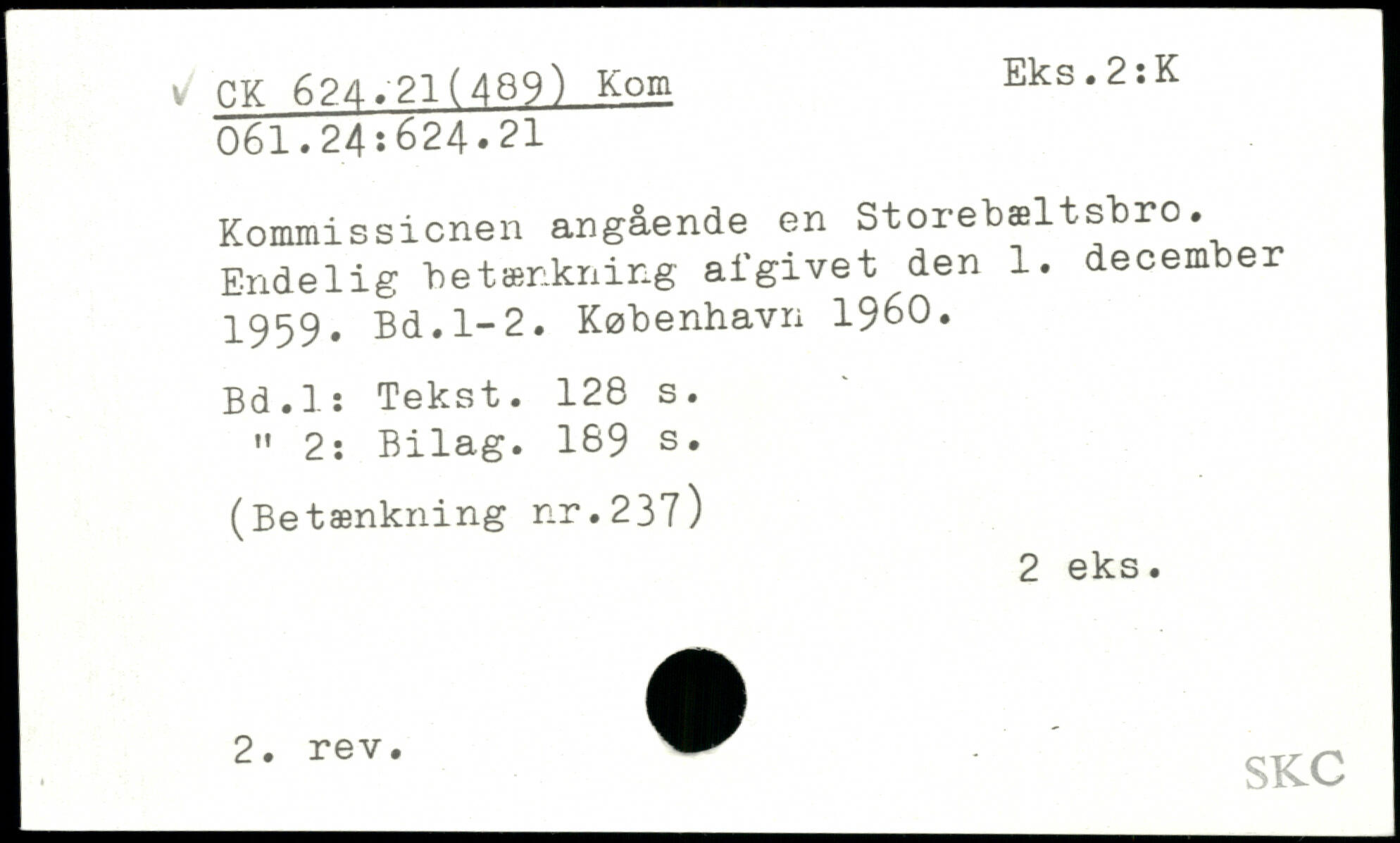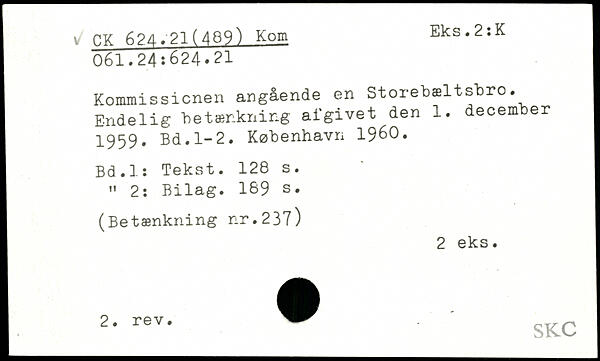 Kommissienen angående en Storebæltsbro. | Endelig betænkning afgivet den 1. december 1959.