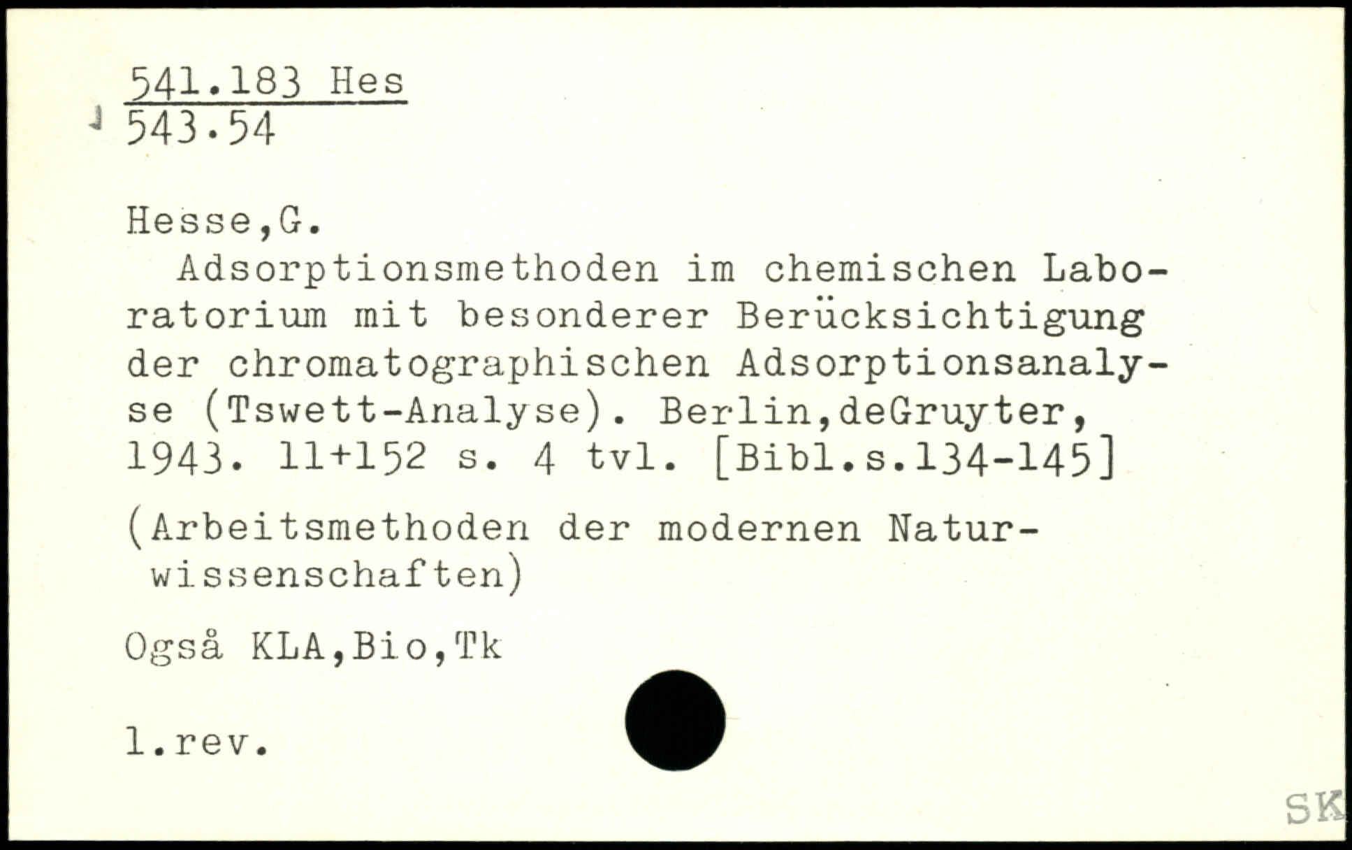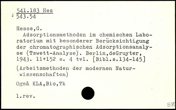 Adsorptionsmethoden im chemischen Laboratorium mit besonderer Berücksichtigung der chromatographischen Adsorptionsanalyse (Tswett-Analyse). Berlin,deGruyter, 1943. H+I
