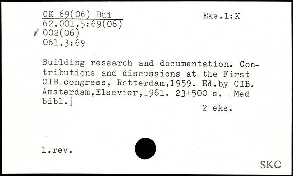 Building research and documentation. Contributions and discussions at the First CIB.congress, Rotterdam,]959. Ed.by CIB.