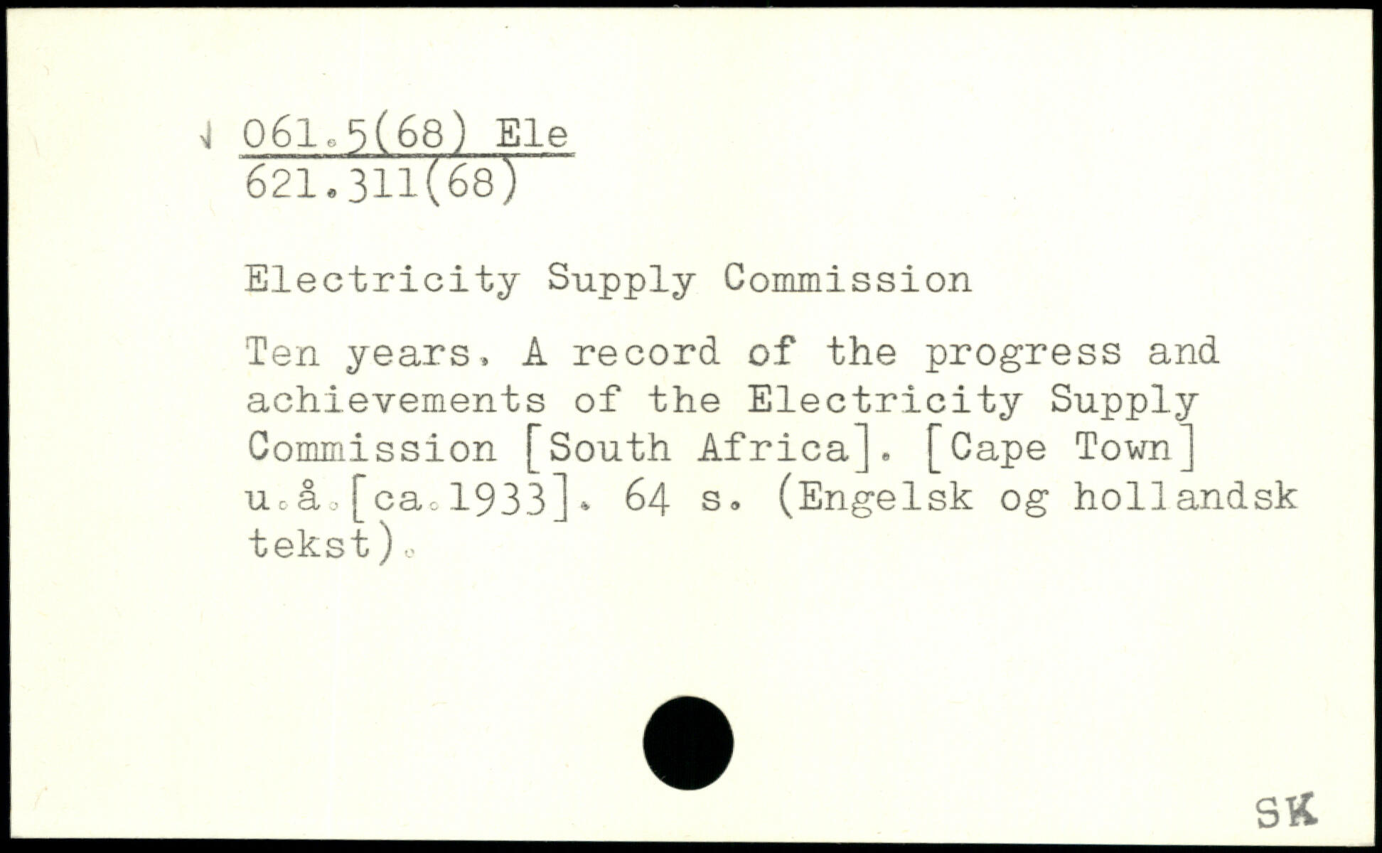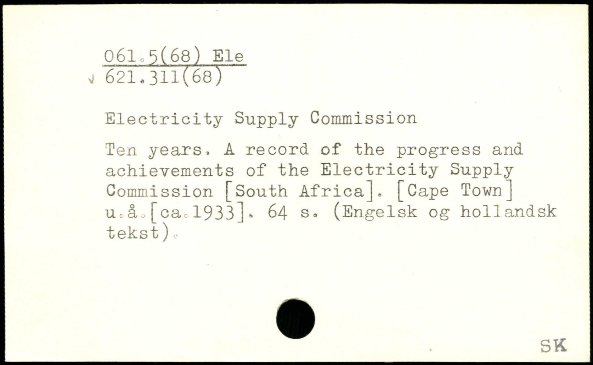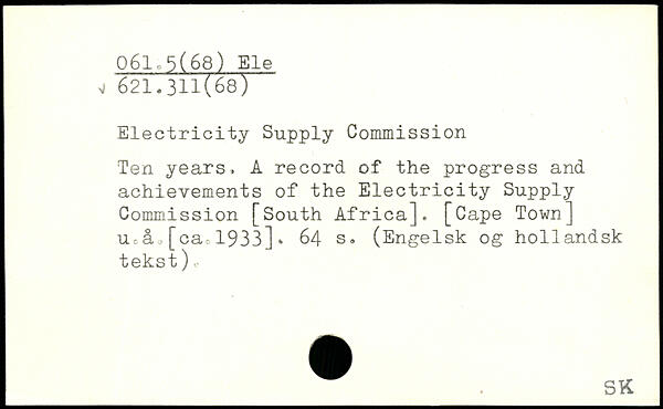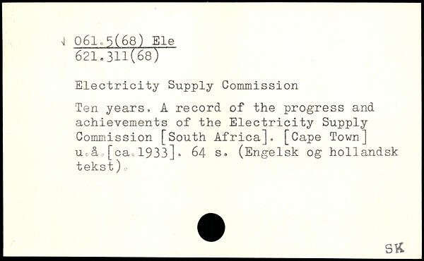 Electricity Supply Commission Ten years, A record of the progress and achievements of the Electricity Supply Commission [South Africa]. [Cape Town] uA, [cac 1933]