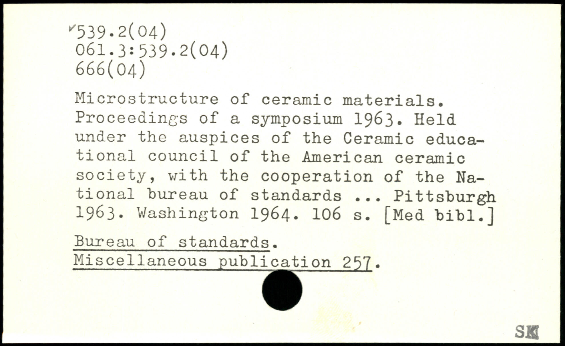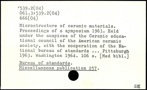 Microstructure of ceramic materials. Proceedings of a symposium 1963, Held under the auspices of the Ceramic educational council of the American ceramic society, with the cooperation of the National bureau of standards ... Pittsburgh 1963.