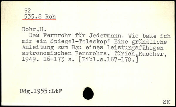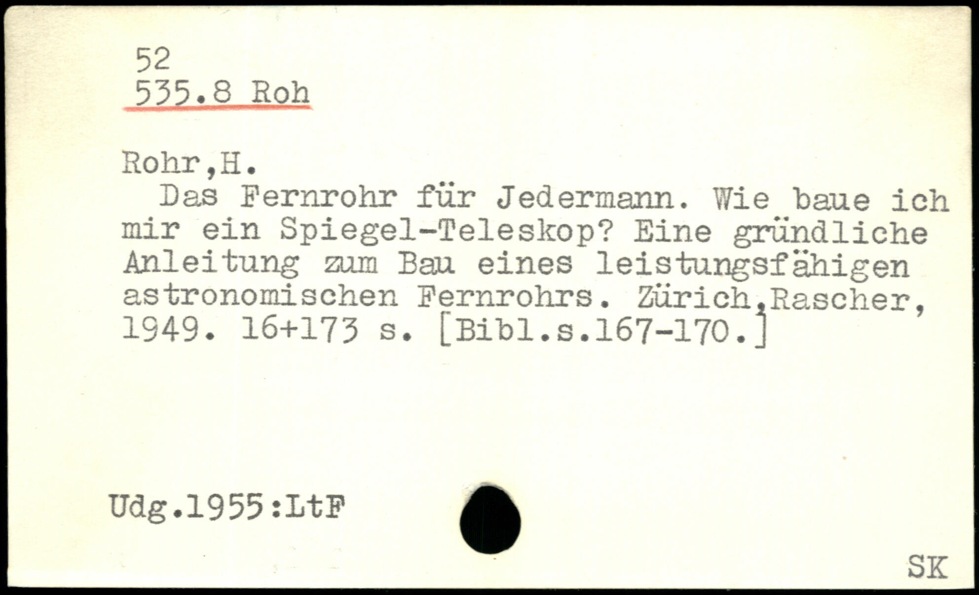 Das Fernrohr für Jedermann. Wie baue ich mir ein Spiegel-Teleskop? Eine gründliche Anleitung zum Bau eines leistungsfähigen astronomischen Fernrohrs. Zürich.Rascher, 1949.