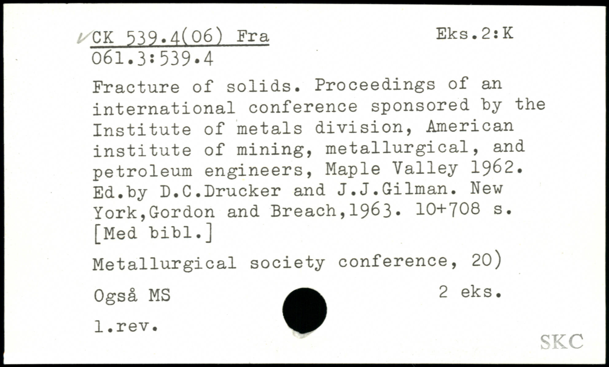 Fracture of solids. Proceedings of an international conference sponsored by the Institute of metals division, American institute of mining, metallurgical, and petroleum engineers, Maple Valley 1962. Ed.by D.C.Drucker and J.J.Gilman.