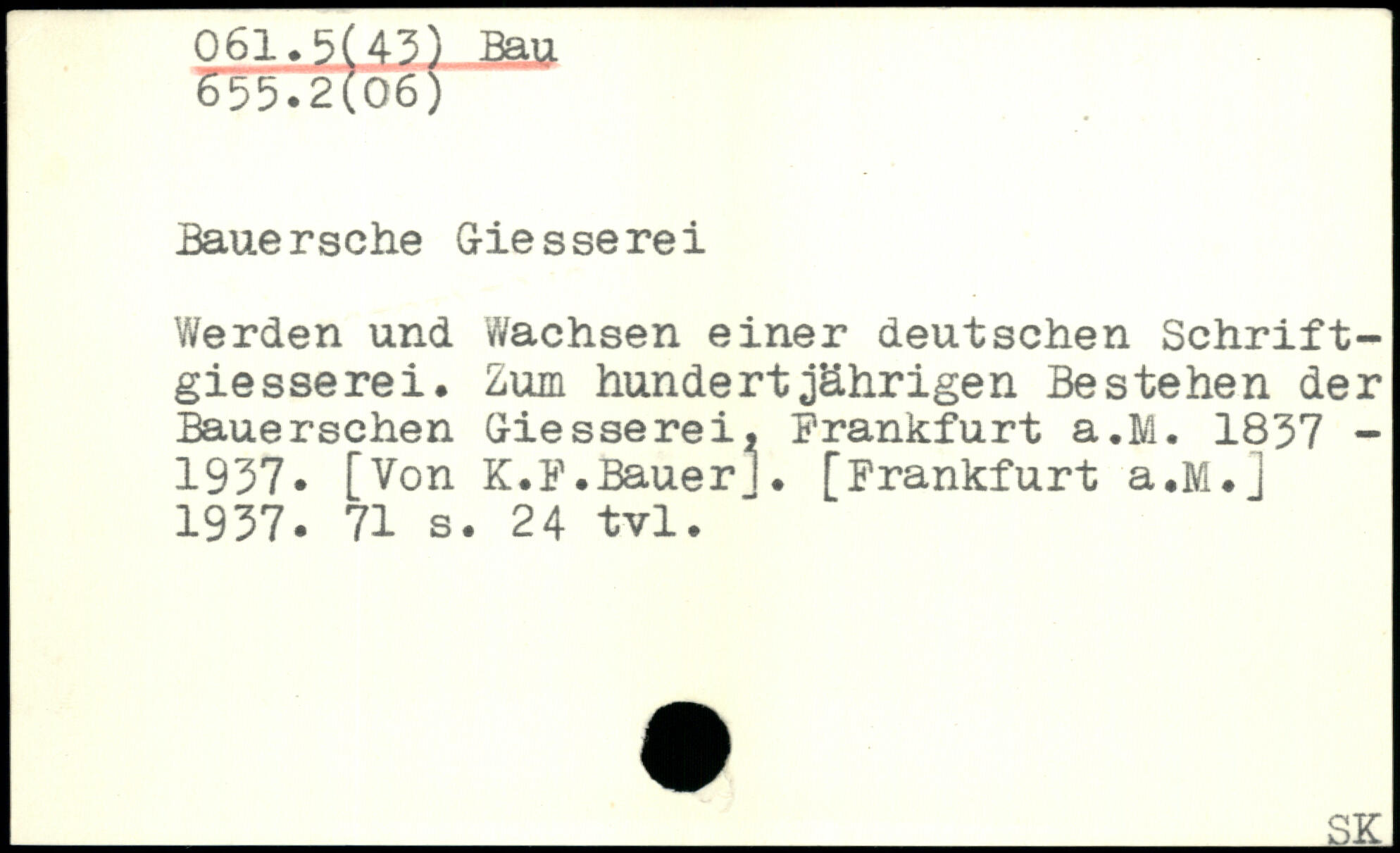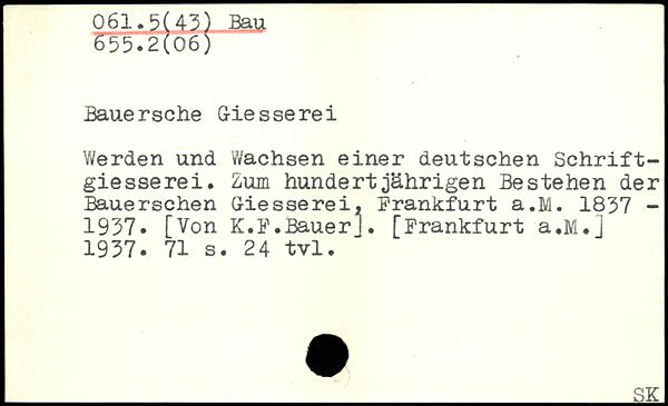 Baue rache Giesserei Werden und Wachsen einer deutschen Schrift-giesserei. Zum hundertjährigen Bestehen der Bauerschen G-iesserei, Frankfurt a.M. 1837 -1937. [Von K.F.Bauerl. [Frankfurt a.M.] 1957.