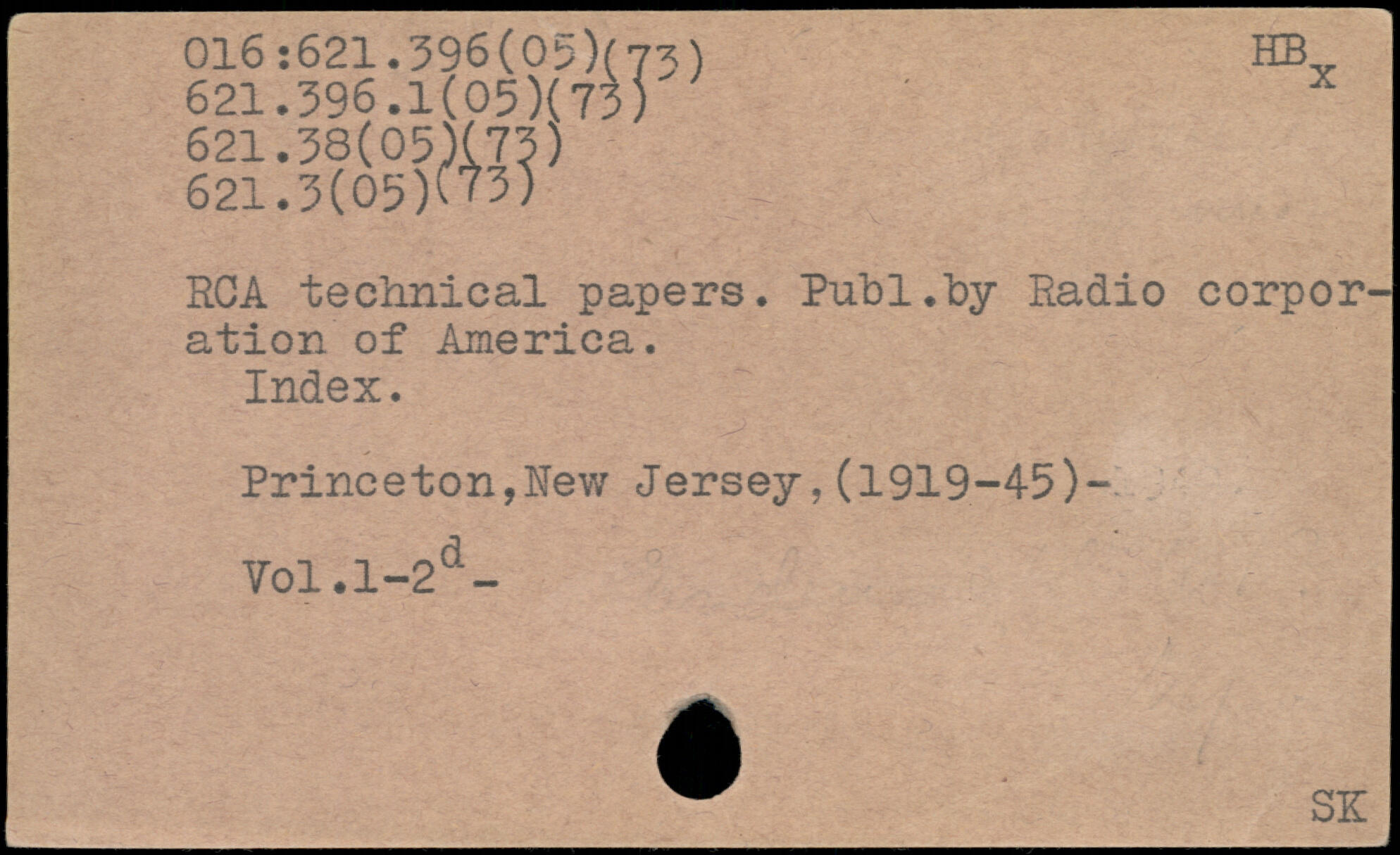 RCA technical papers. Publ,by Radio corporation of America. Index. Princeton,New Jersey,(1919-45)-Vol.l-2d- W SK